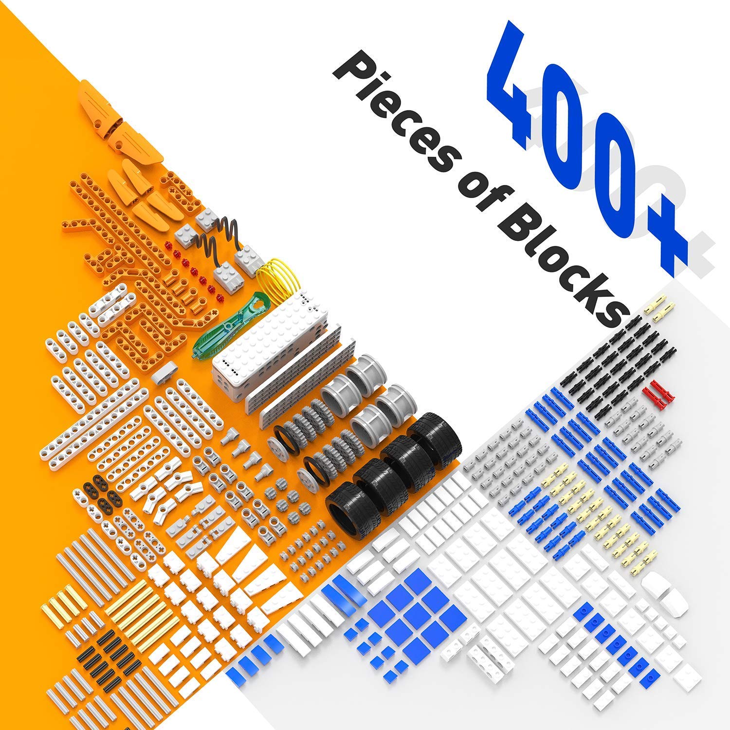 18 IN 1 ROBOT KIT: Includes 400+ blocks, 1 control unit with 4 multicolour LED lights, 2 infrared sensors, and 2 DC motors, that kids can build and rebuild into 18 cool robots, like Jeep, Cars, Tiger, Music Box, Parking System, Delivery Man, Chariot, Telegraph Machine, Drawing Robot, etc. Perfect gift for 8+ year old boys and girls. (3 x AA batteries are required and not included)