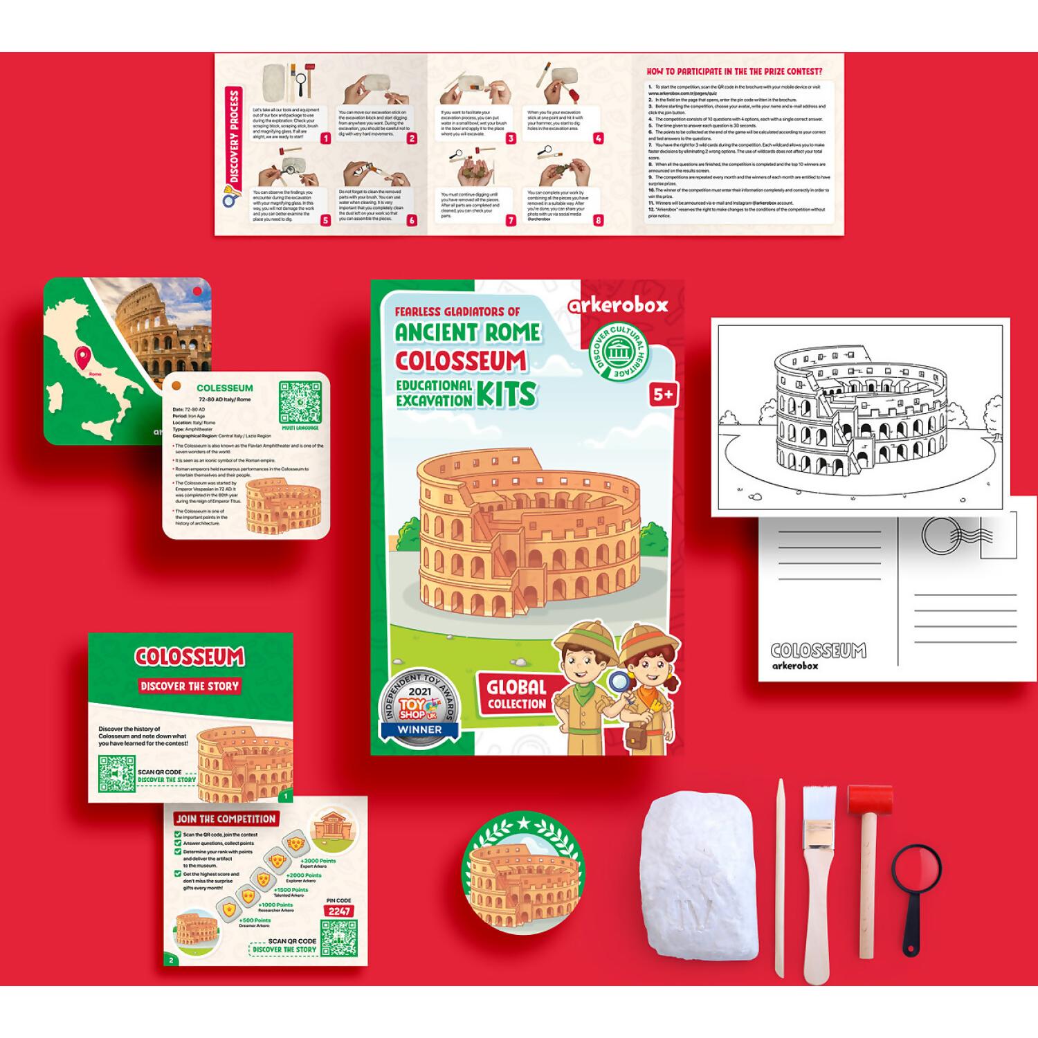 The Arkerobox - Colosseum is an educational archaeological excavation set that enables children to learn with experience. It is among the innovative education methods to raise awareness towards global cultural heritage. The set is designed to provide a hands-on experience of the historical marvel that is the Colosseum.