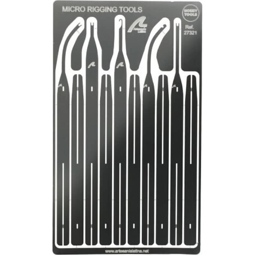 The Artesania 27321 Micro Rigging Tool is a precision-crafted set designed specifically for rigging wooden model ships. It includes five stainless steel tools—four pushers or guides in assorted straight and curved shapes, and one hook—ideal for threading, tying, and guiding rigging lines with accuracy. These tools are engineered to provide enhanced control and comfort during detailed modelling work.