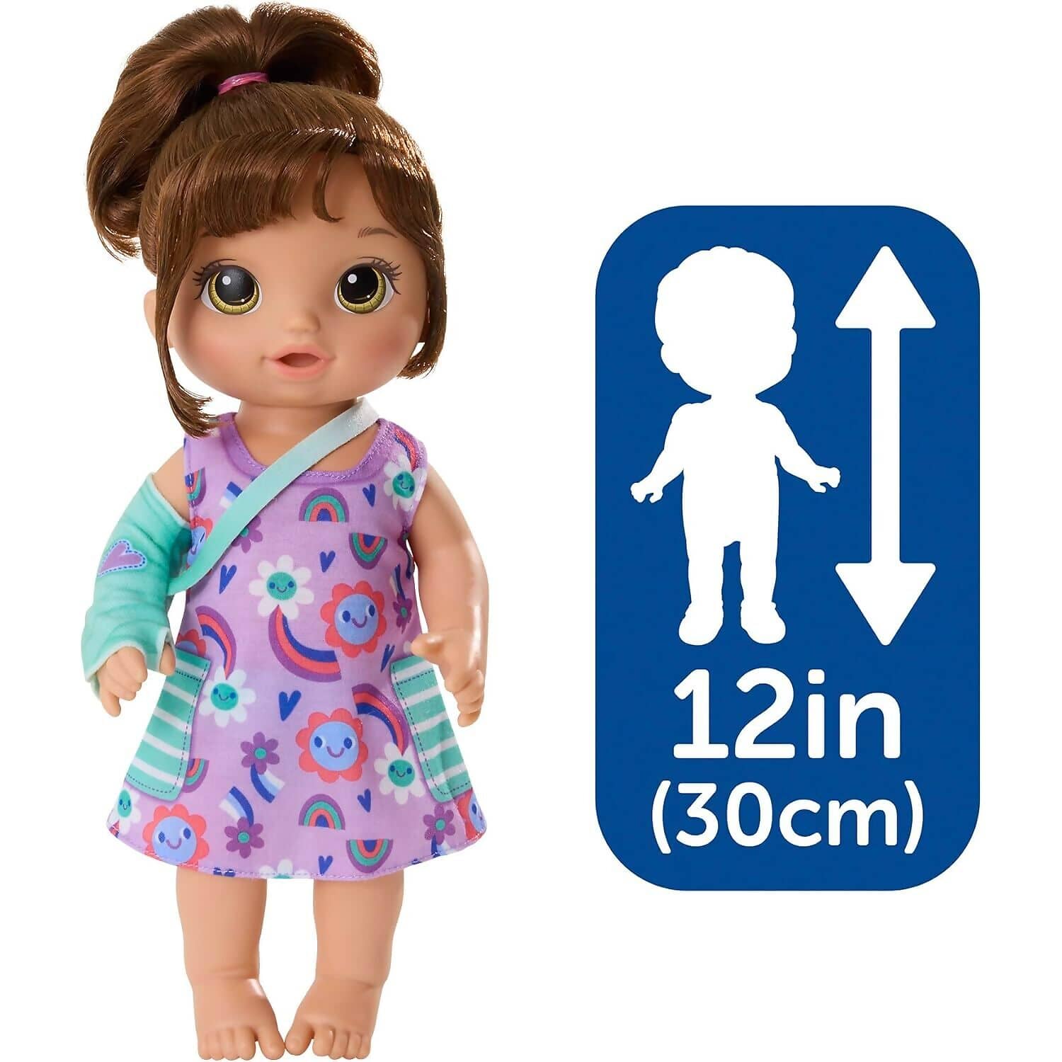 - 12-inch Baby Alive doll with brown hair and hazel eyes