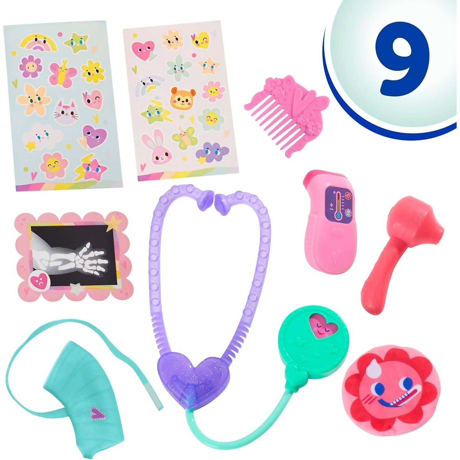 - Comes with 8 accessories: arm cast, stickers, stethoscope, ear checker, thermometer toy, pretend compress pack, 2 x-ray sheets, and comb
