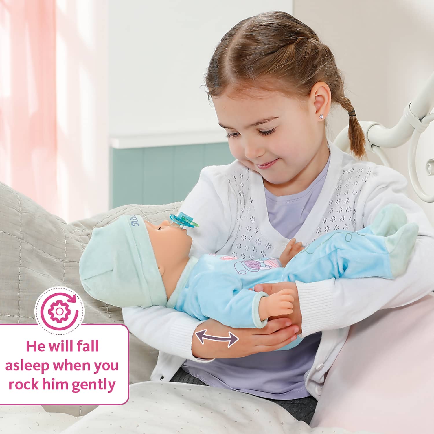 Baby Alexander has a wide range of realistic, interactive features. He can make crying noises when upset, but a cuddle or a tickle will make him giggle again. His mouth will move when drinking or sucking his dummy and his eyes gently close when you rock him to sleep. He will even make a baby pop sound when he has wind!