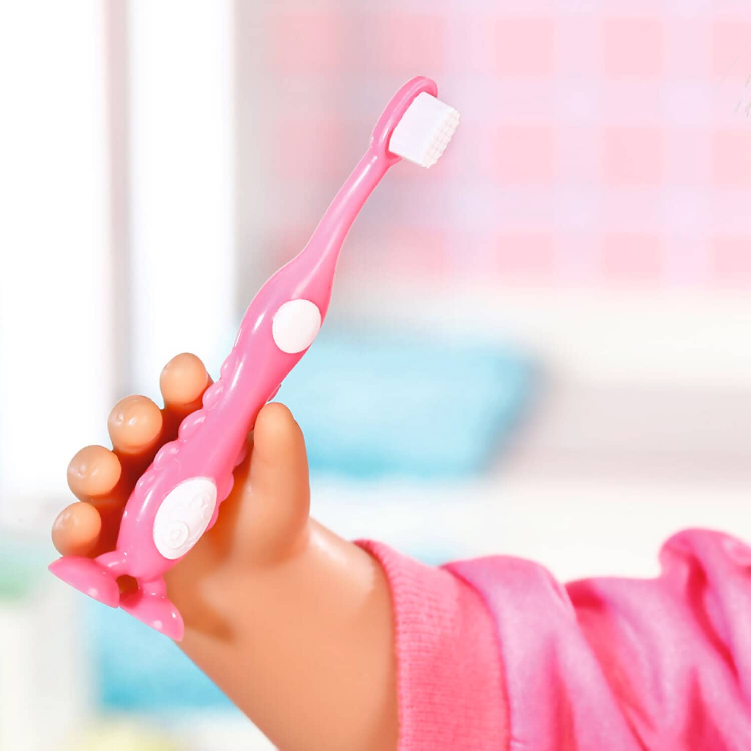 Once she’s all dressed and cosy, it’s time to brush her teeth with the tiny pink toothbrush. When it’s time for bed, pop the blue bunny sleep mask over BABY born’s eyes and lie her down on the comfy pillow with multi-coloured bobbles. Good night BABY born! BABY born Bath Deluxe Good Night fits dolls up to 43cm and is suitable for children aged three and above. Designed to enhance imaginative doll play.