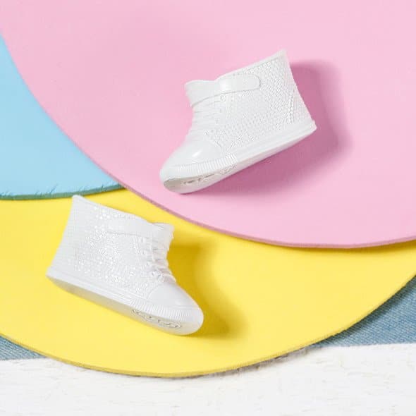 BABY born’s outfit in jeans look sports playful turn-ups on the arms, a symmetrical collar, sewn-on pockets and a belt to tie it all together. It is decorated with cute prints that look like sewn-on patches. Underneath, the little fashionista wears leggings with black and white stripes along with white trainers. Her head is adorned by a pink hat.