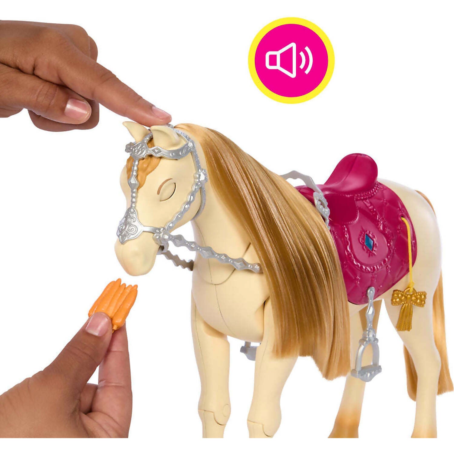 This Barbie horse dances, blinks its eyes, plays songs inspired by the show, and makes fun sounds like neighs, munches, gallops, and more. Accessories like a trophy, food, brush, and feeding bin let imaginations run wild with Barbie and her new horse friend, Tornado!