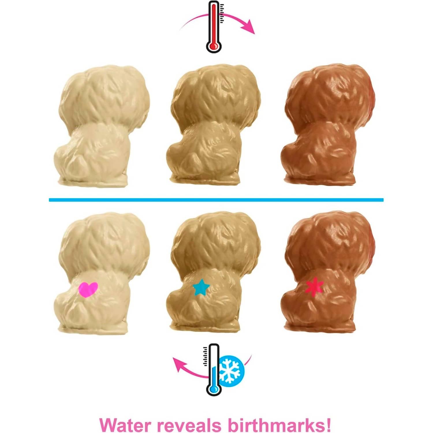 After welcoming the puppies, kids can fill the tub with ice-cold water, then dip the towel in and swipe it over the puppies to reveal a special birthmark on each. Barbie® doll's flexible knees help her welcome her new pets, and with an adorable puppy carrier featuring room for all three pups, she can care for them on the go!