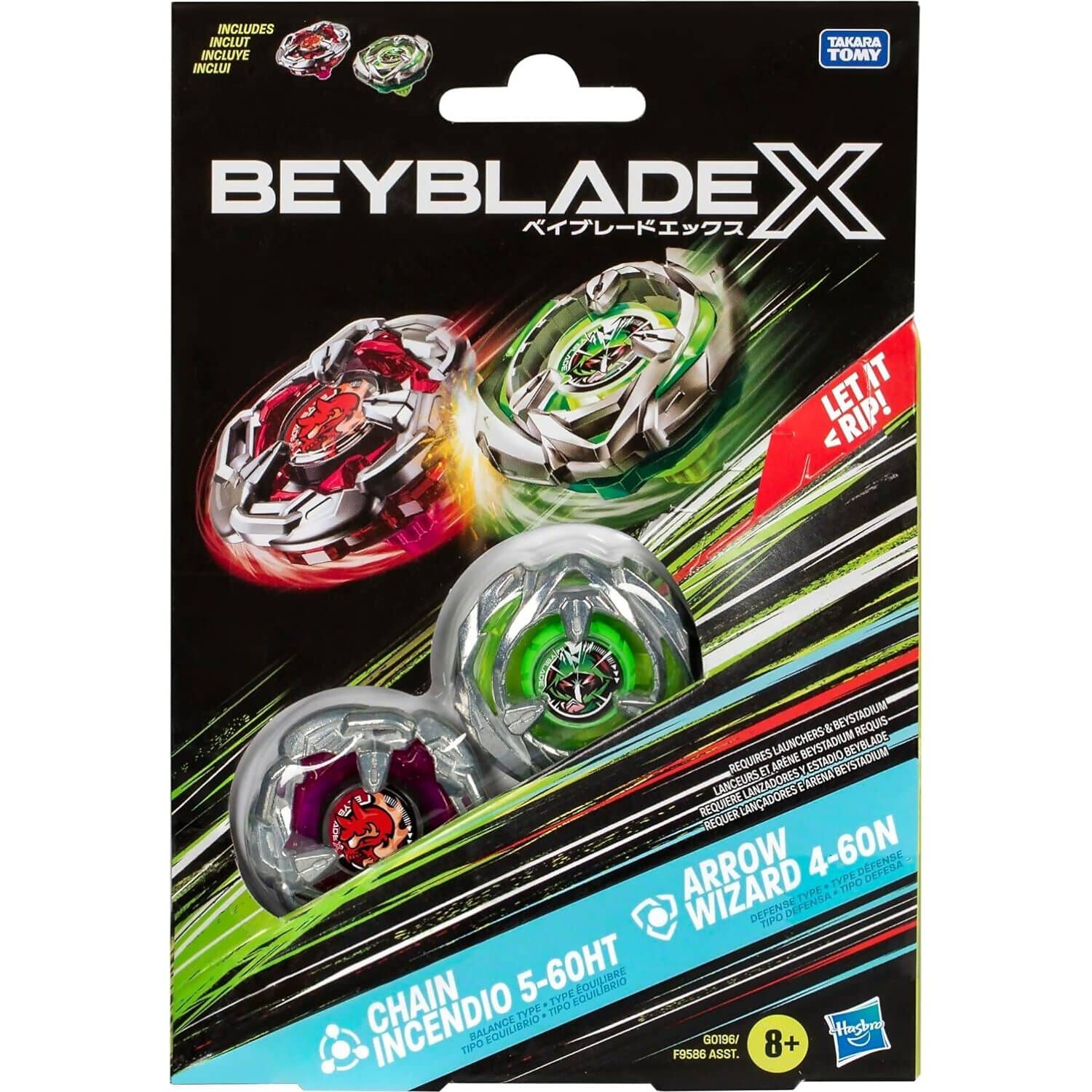 - Includes 2 right-spinning Beyblade X tops: Chain Incendio 5-60HT and Arrow Wizard 4-60N