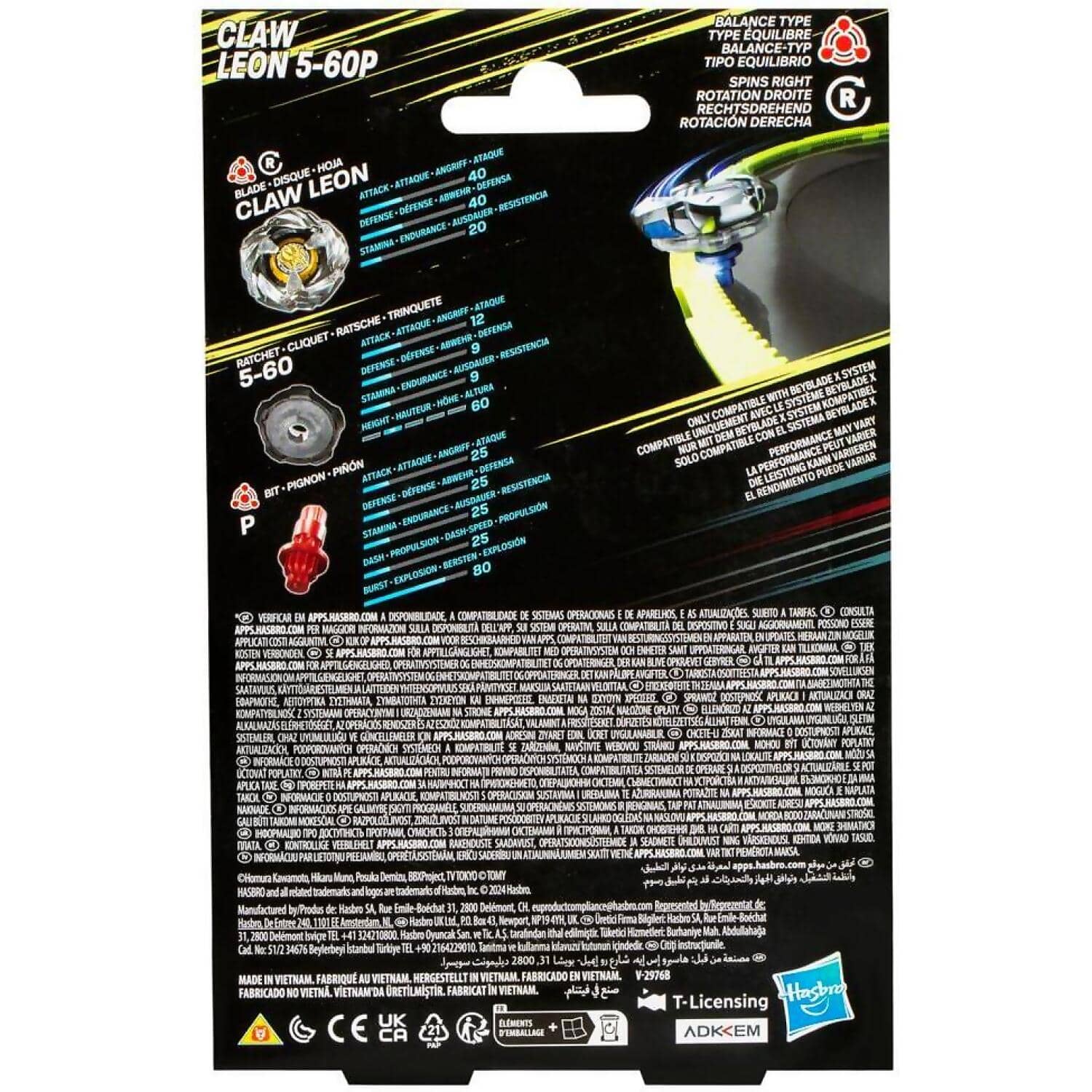 Experience the thrill of the next generation of Beyblade stadiums, launchers and tops: Beyblade X with the Beyblade X Claw Leon 5-60P Starter Pack which includes 1 right-spinning Balance Type top and launcher (Beystadium required, sold separately).