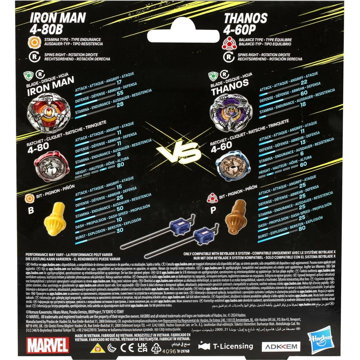 - HARNESS THE POWER: Includes 2 Takara Tomy-designed Beyblade X tops with authentic die-cast metal parts: Iron Man 4-80B Right-Spin Stamina Type and Thanos 4-60B Right-Spin Balance Type; and 2 launchers