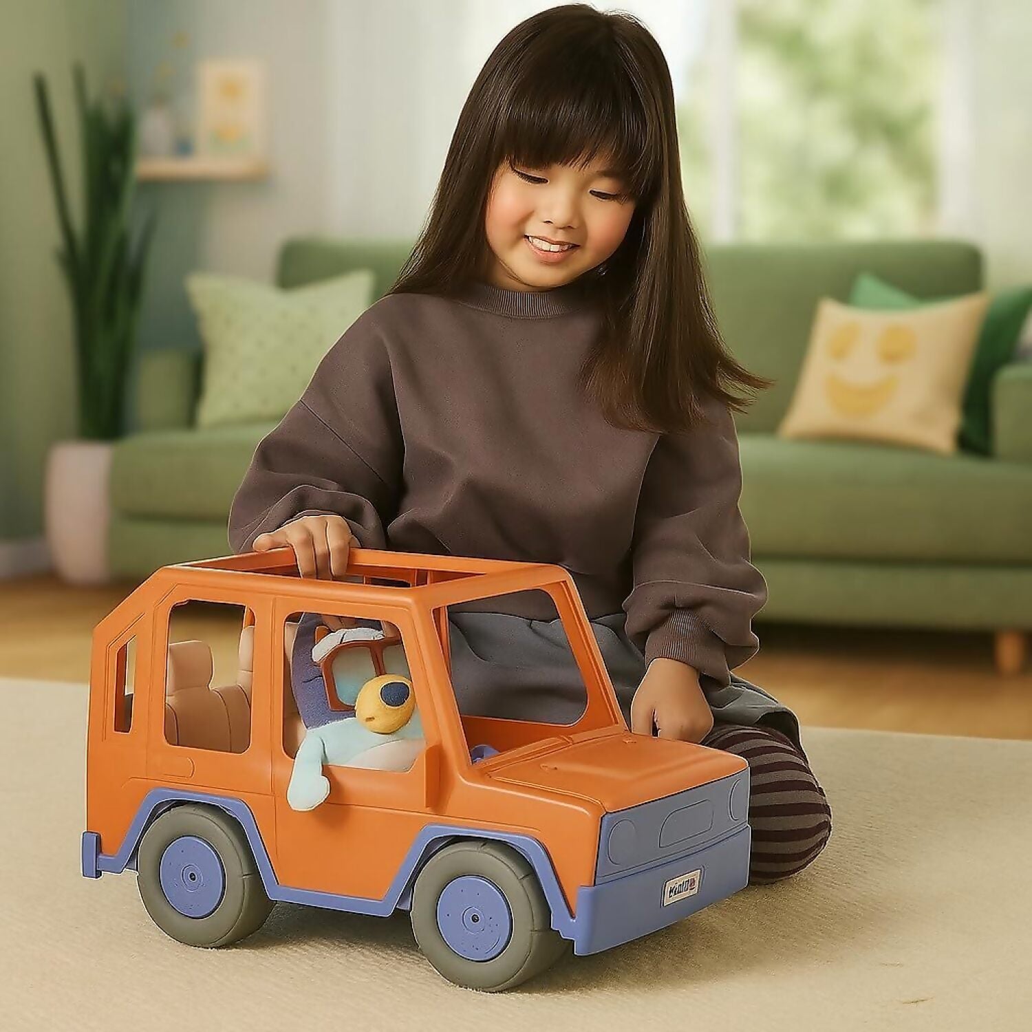 Take your favourite Bluey plushies on a road trip with the Bluey Buddies Big Heeler 4WD & Bluey set. This mega-sized Heeler family vehicle is designed to fit up to four Bluey Friends plush toys, making it perfect for imaginative group adventures. Included is an exclusive 20cm Bluey plush wearing her signature sunnies, crafted from deluxe fabrics with embroidered details for added charm.