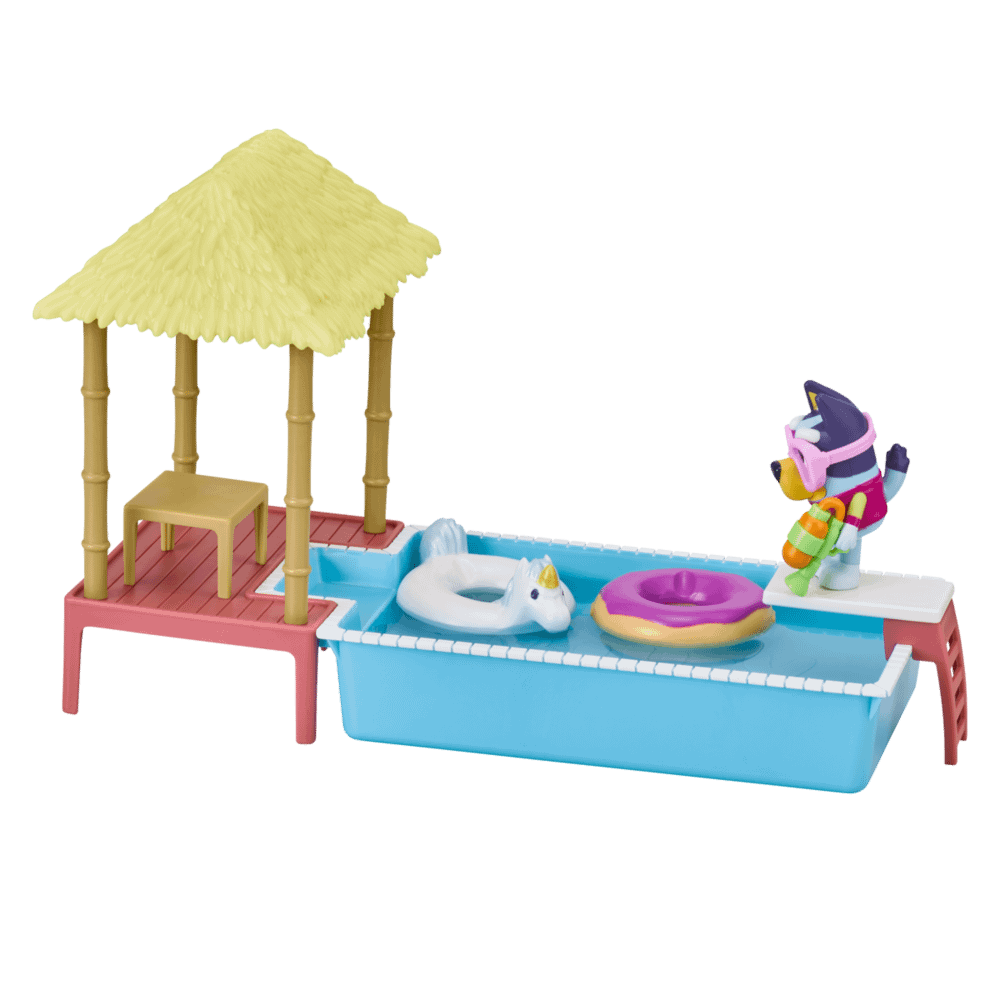 The Pool Time Playset allows you to bring the fun and imaginative play of Bluey into your home. Take a break from the sun and relax on the deck under the cabana. Dressed in her swim suit, Bluey is ready for some fun in the sun with all her pool toys and accessories. Dive Bluey off the diving board and go for a swim.