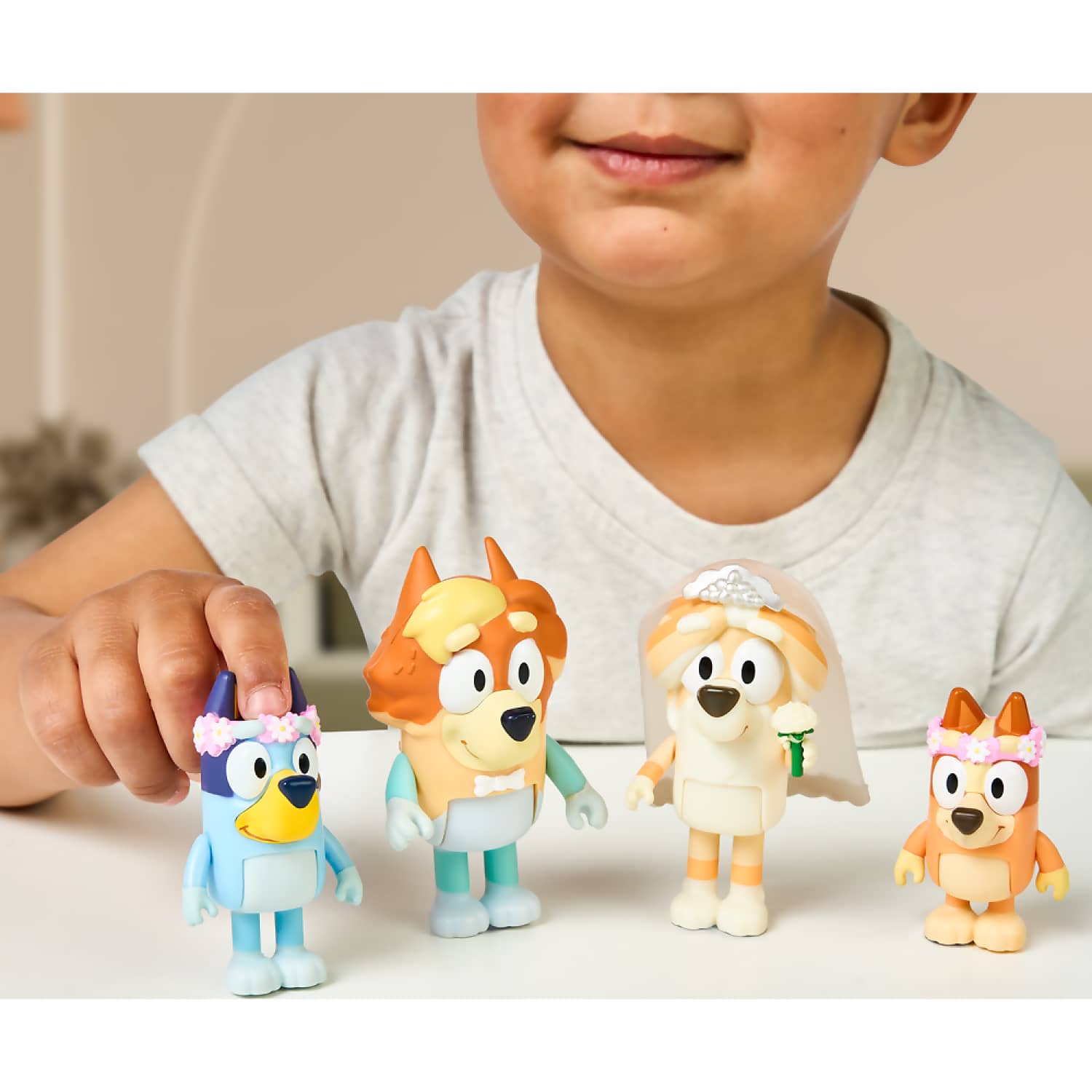 Bring home the fun and imaginative play of Bluey and her family with this adorable Bluey 'Wedding Time' Figure 4 Pack! Uncle Rad is ready to tie the knot with Frisky, and Bluey and Bingo have joined the celebration as flower girls wearing beautiful flower crowns. Uncle Rad is wearing a bow tie and Frisky looks wonderful in her wedding veil. She also has a bouquet she can hold in her hand!