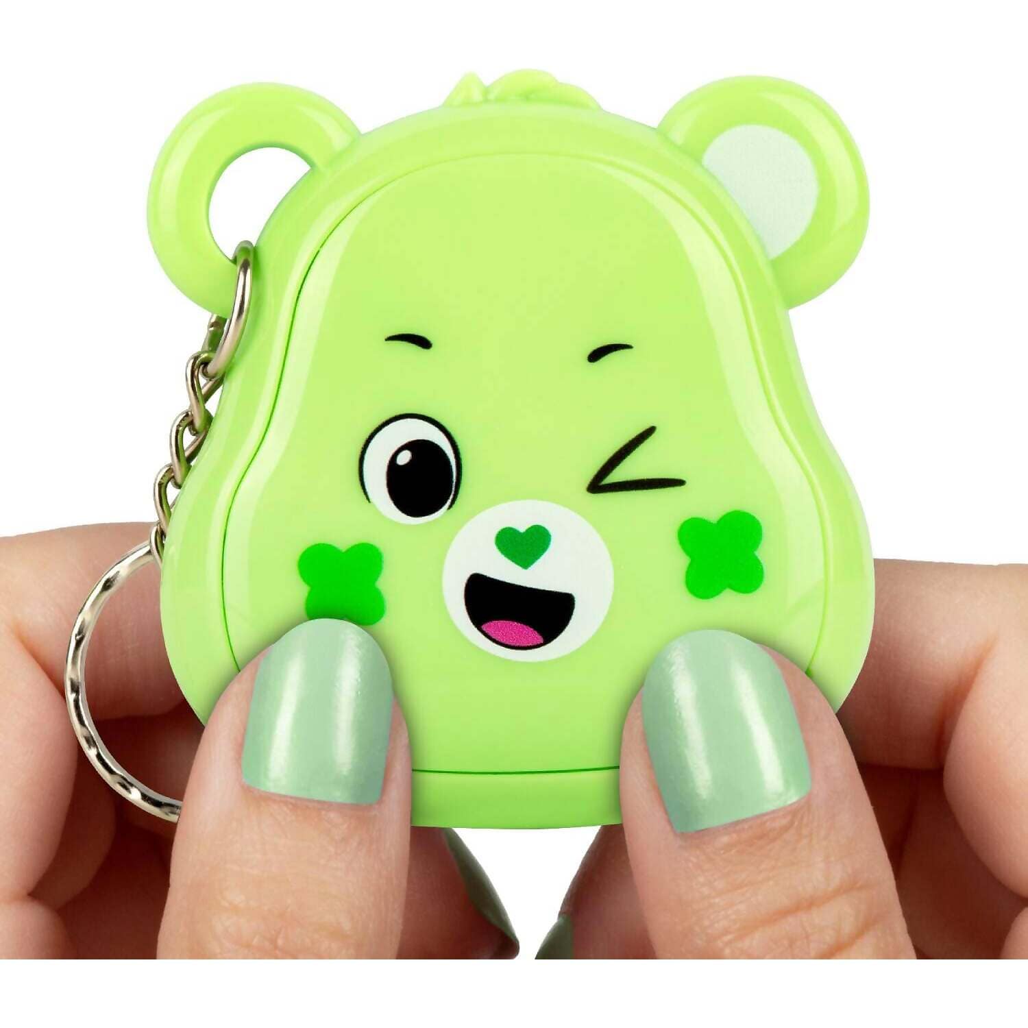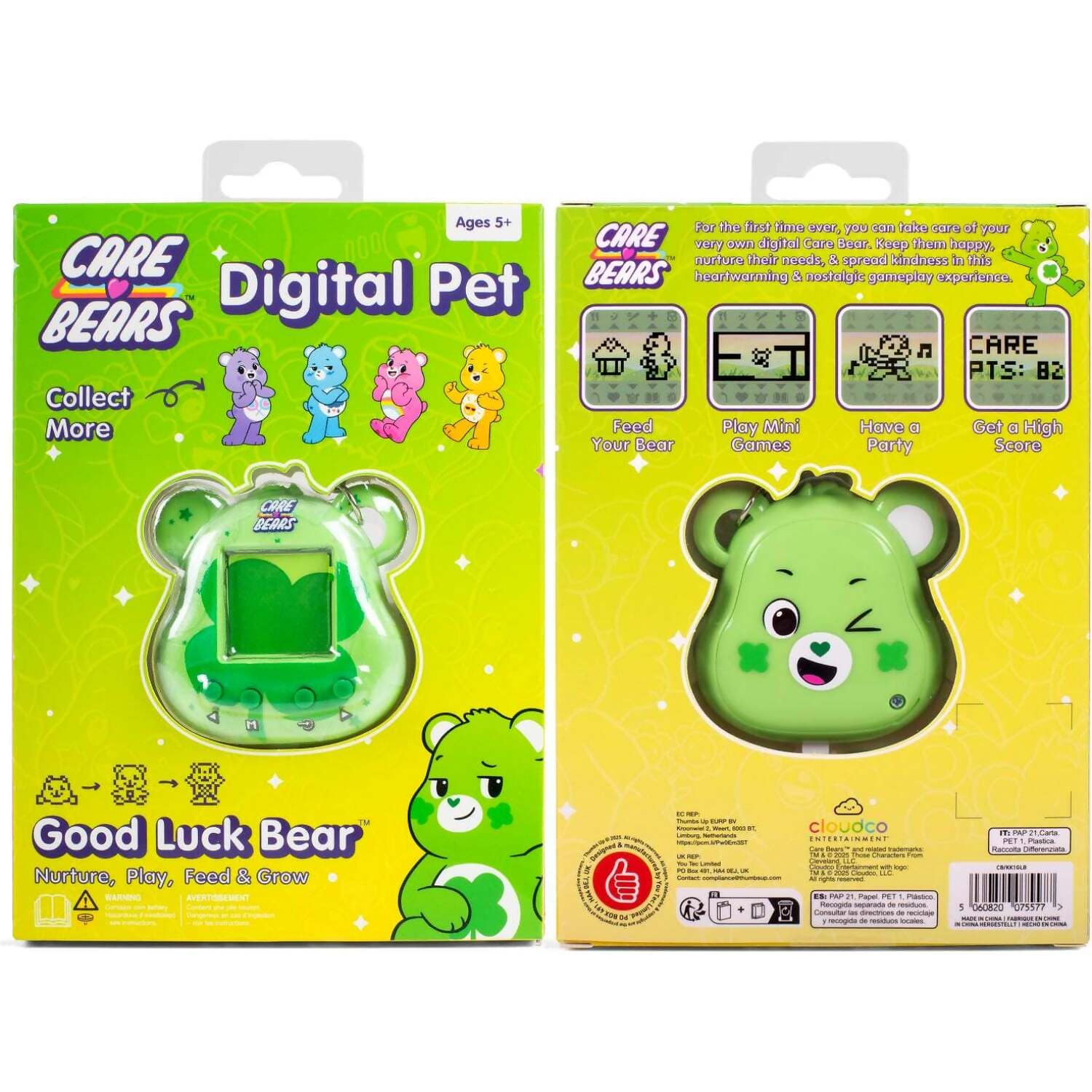 Good Luck Bear brings his bright charm and cheerful spirit to this sweet digital pet. Kids can look after him with simple feeding moments, small care tasks, and fun mini games that feel warm and easy to enjoy. His four leaf clover belly badge shows up in cute pixel art that gives the toy a cosy retro feel.