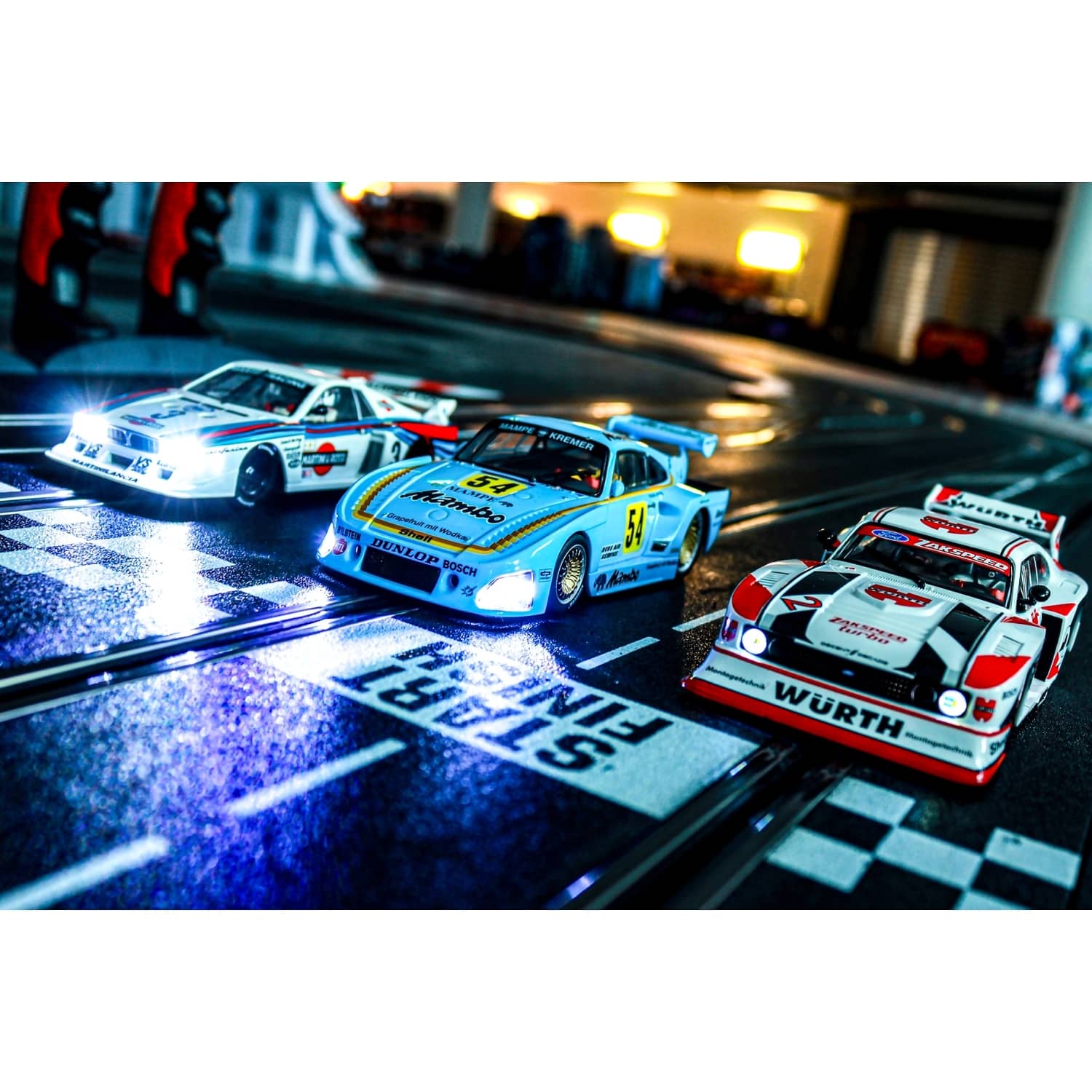 This Digital 1:32 slot car set commemorates Carrera’s 60th anniversary by staging a three-way retro Grand Prix battle on a 9.3-metre circuit. It features three authentic reproduction models: the 1981 Lancia Beta Montecarlo Turbo “Martini Racing No. 3”, the DRM-winning Porsche Kremer 935 K3 “No. 54” and the 1982 Zakspeed Ford Capri Turbo “Würth No. 2”. High-quality tampo printing and licensed body shells bring these historic racing legends vividly to life.