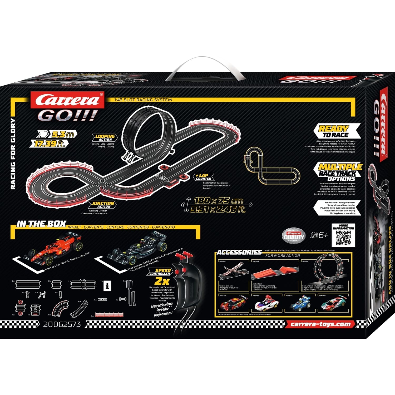 The Racing For Glory slot car track set brings the thrill of Formula 1 racing to Carrera GO 1:43 scale, offering an action-packed experience for young and seasoned racers alike. Featuring iconic F1 cars, including a Mercedes-AMG F1 W14 E Performance and a Ferrari SF-23, this set allows players to compete head-to-head in high-speed battles. With a 5.3-metre track length, racers can master sharp corners, looping sections, and straightaways for intense competition.