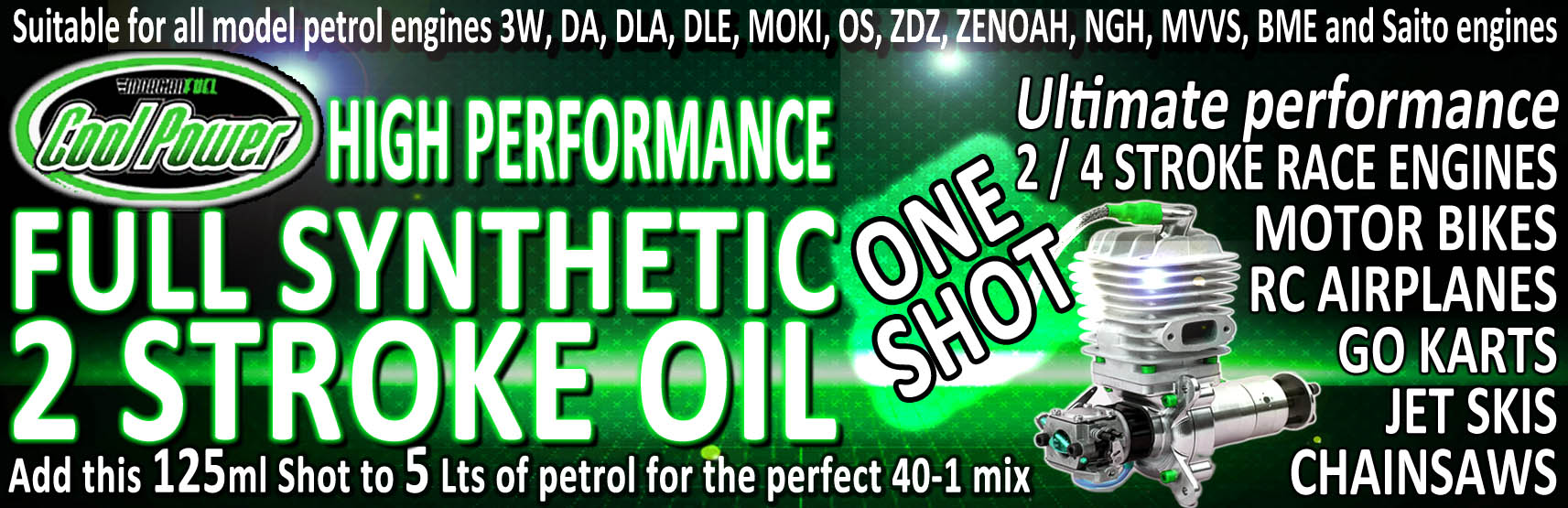 Mixes with leaded and unleaded gasolines and is specially recommended at 50:1 or in accordance with manufactures recommendations. Suitable for use in engines manufactured by: YS, Magnum, Saito, OS, Roto Motor, 3W, DA, DLA, DLE, Moki, ZDZ, Zenoah, MVVS, Evolution, and BME. FILM STRENGTH: The metal parts are separated by a layer or film of lubricant strong enough to keep them apart. Two such additives are in our fuels. One is surface active (molecular structure), the other is through brute strength. This is by far the most important additive in any lubricant.EXTREME PRESSURE: This is also to keep moving parts separated. The difference between this and film strength is that film strength is for a sliding motion, and extreme pressure is for pounding motion such as the connecting rod. LUBRICITY: This adds a slickness to the lubricant. This is an expensive additive. The lack of this component shows up in two areas -- top end performances and long term wear on the engine. WETTING AGENT: An additives that makes the lubricant flow more evenly and thoroughly over the metal surfaces. It eliminates the smallest dry or non lubricated spots. It also helps the lubricant get into the very tight fitting places in the engine. RUST PREVENTER: This is the second most important additive. Synthetics tend to attract and hold moisture causing rust during engine non use. Our rust preventative is not the standard phosphoric compound found in most oils, (phosphoric compounds are only partially effective), ours however, in most conditions are, 100% effective. DETERGENTS: There are two in our oil. This prevents build-up of varnish in the engine. ANTI- FOAMER: Helps prevent bubbles from forming in the fuel. Bubbles are caused by vibrations from the engine. These bubbles are taken into the engine along with the fuel and can cause lean engine runs. More bubbles are formed at a higher power setting. Fewer bubbles are caused at the lower power setting, but the anti-foamer helps the engine run better at all settings. e anti-foamer helps the engine run better at all settings. 125ML ONE SHOT BOTTLE = $6.991 LITRE BOTTLE $39.99 3.7 LITRES BOTTLE $144.99 NOTE: REFILL YOUR ONE SHOT BOTTLE TO GET THE CORRECT MIXTURE EVERY TIME