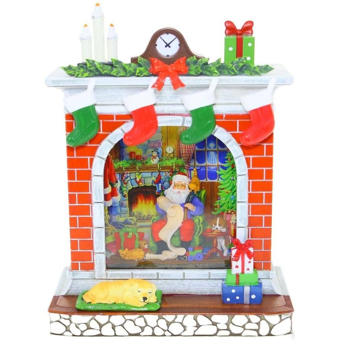 - Features Santa Claus by the fireplace