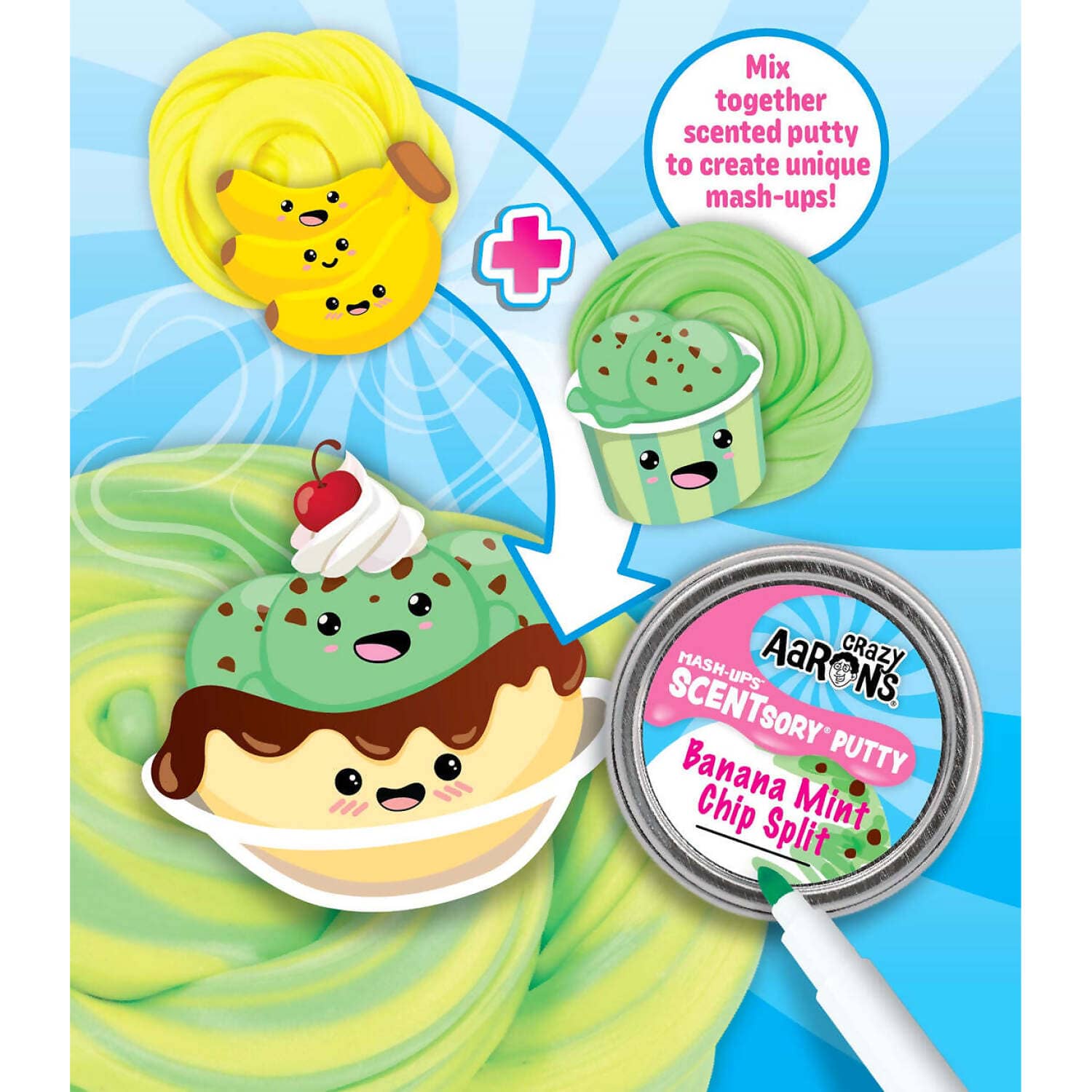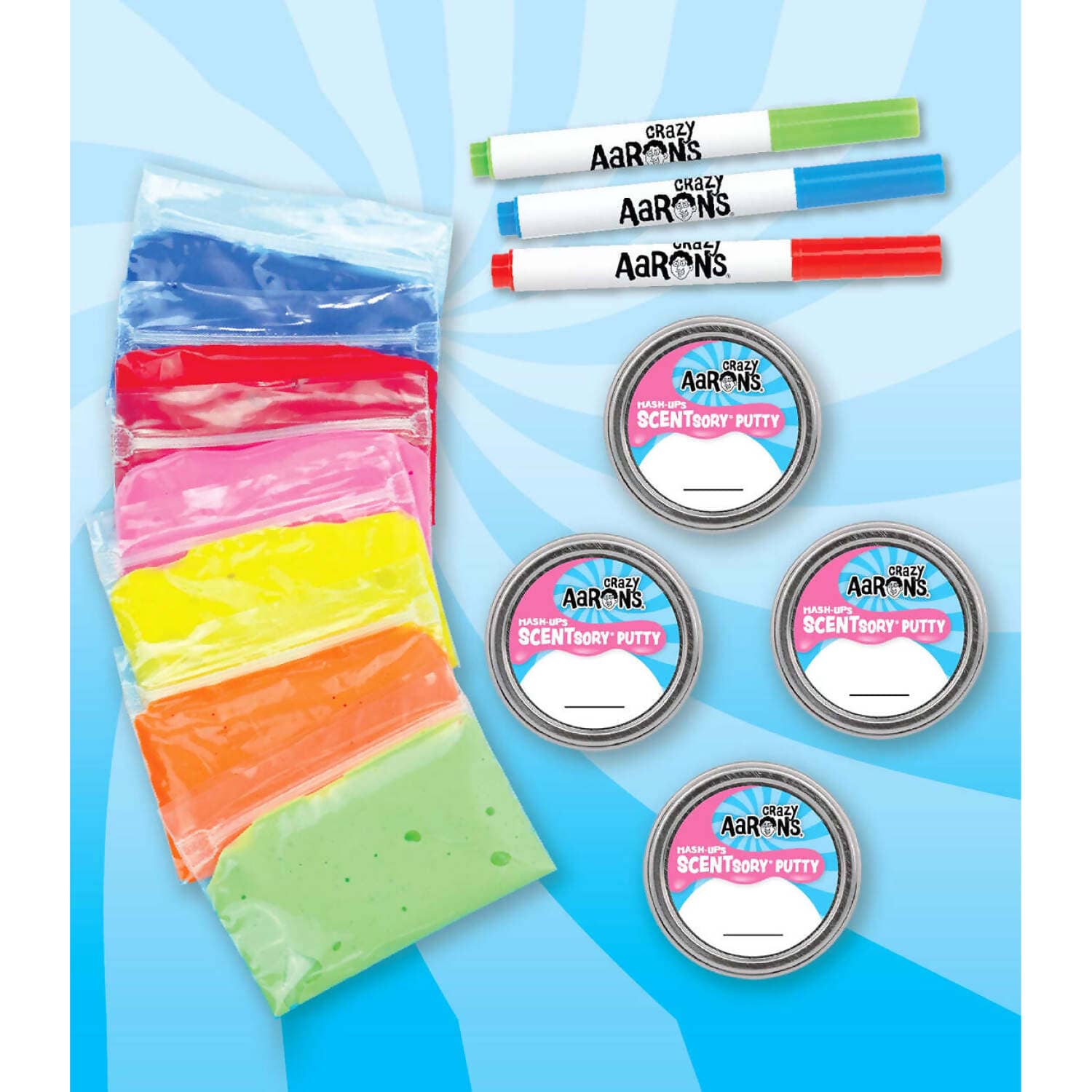 Crazy Aarons Mixed by Me SCENTsory® Mash-Ups lets you create your own unique scented putty combinations for a personalised sensory experience. With six varieties of scented putty, you can mix and match to craft exciting new blends that engage both smell and touch. The included markers allow you to design custom labels, making each creation truly your own.