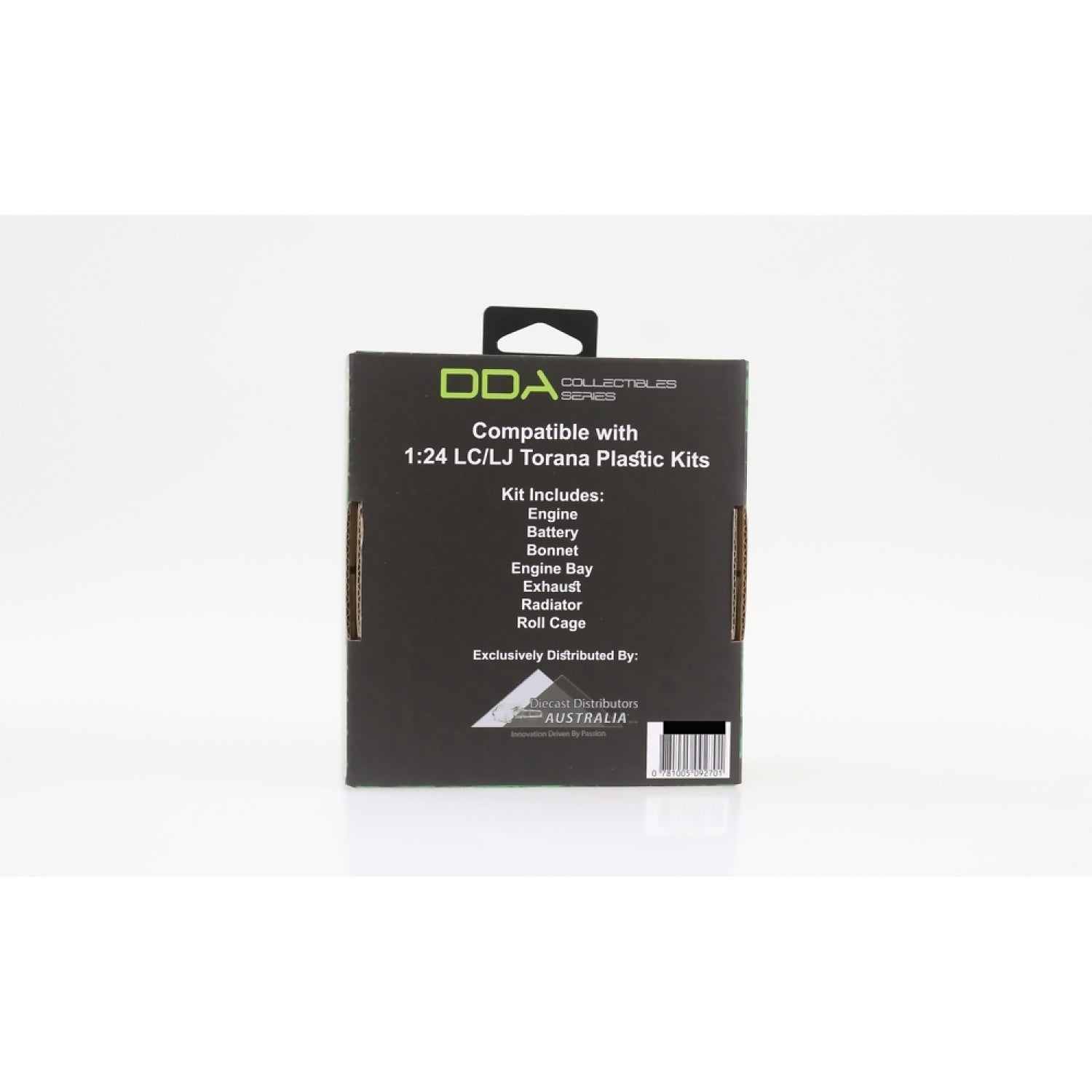 The kit includes a full engine block, bonnet scoop, radiator, exhaust system, fuel tank, battery, rear spoiler, and roll cage. Each piece is precision-moulded to fit seamlessly within compatible DDA Torana kits, delivering authentic scale accuracy. Ideal for hobbyists seeking to elevate their model’s realism, this accessory pack adds depth and mechanical character to any display.