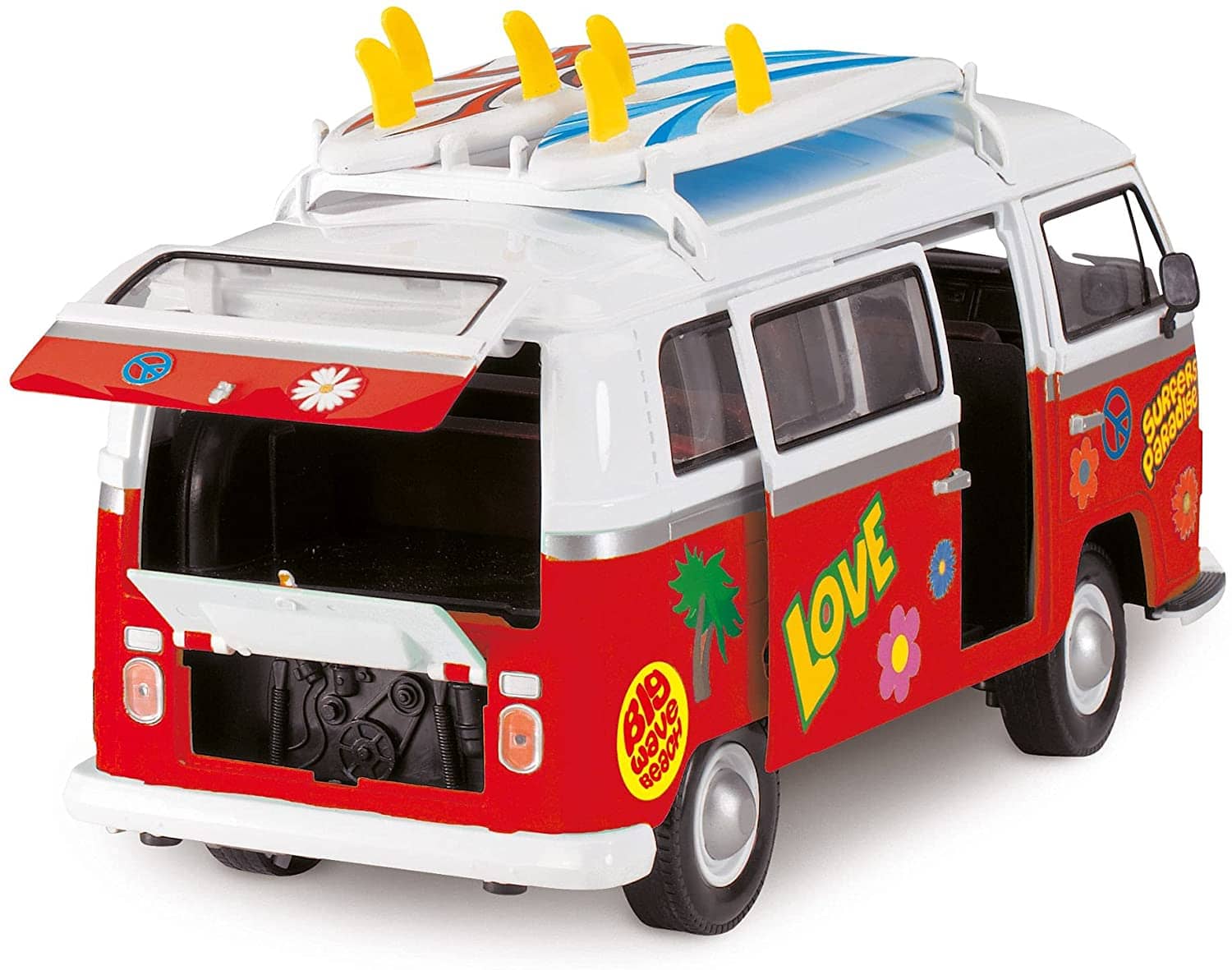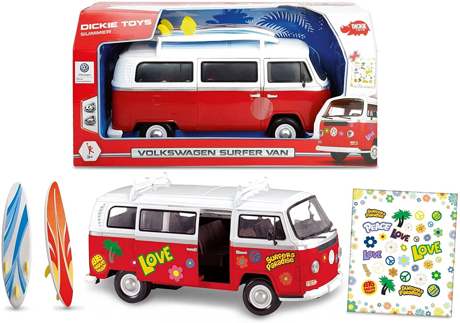 Dickie Toys Surfer Van - dreaming of freedom! There's barely another car that represents freedom and summer quite like the VW camper van. The Summer Van from Dickie Toys is a child-sized version designed with careful attention to detail. The nostalgic friction-driven bus has opening doors so you can take a peek inside. The two surfboards on the roof can be removed. Just as you would expect with a flower power camper children can make it totally unique by decorating it with the stickers provided. The toy car won't just appeal to children but will also rekindle adult dreams of unlimited freedom. When all's said and done it's simply a cult car! - friction-driven toy van - opening doors - two removable surfboards - stickers - licence VW - scale 01:14 - length 32 cm - recommended age 3-5 years
