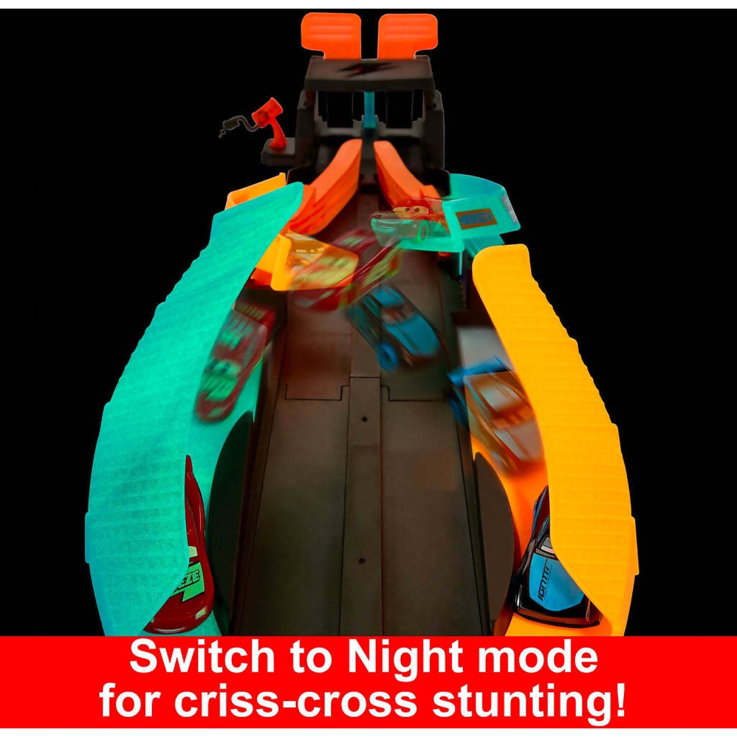 With two ways to play and glow-in-the-dark features, kids can launch the racers straight across when configured in 'daytime mode' or reconfigure for 'nighttime mode' criss-cross stunting.