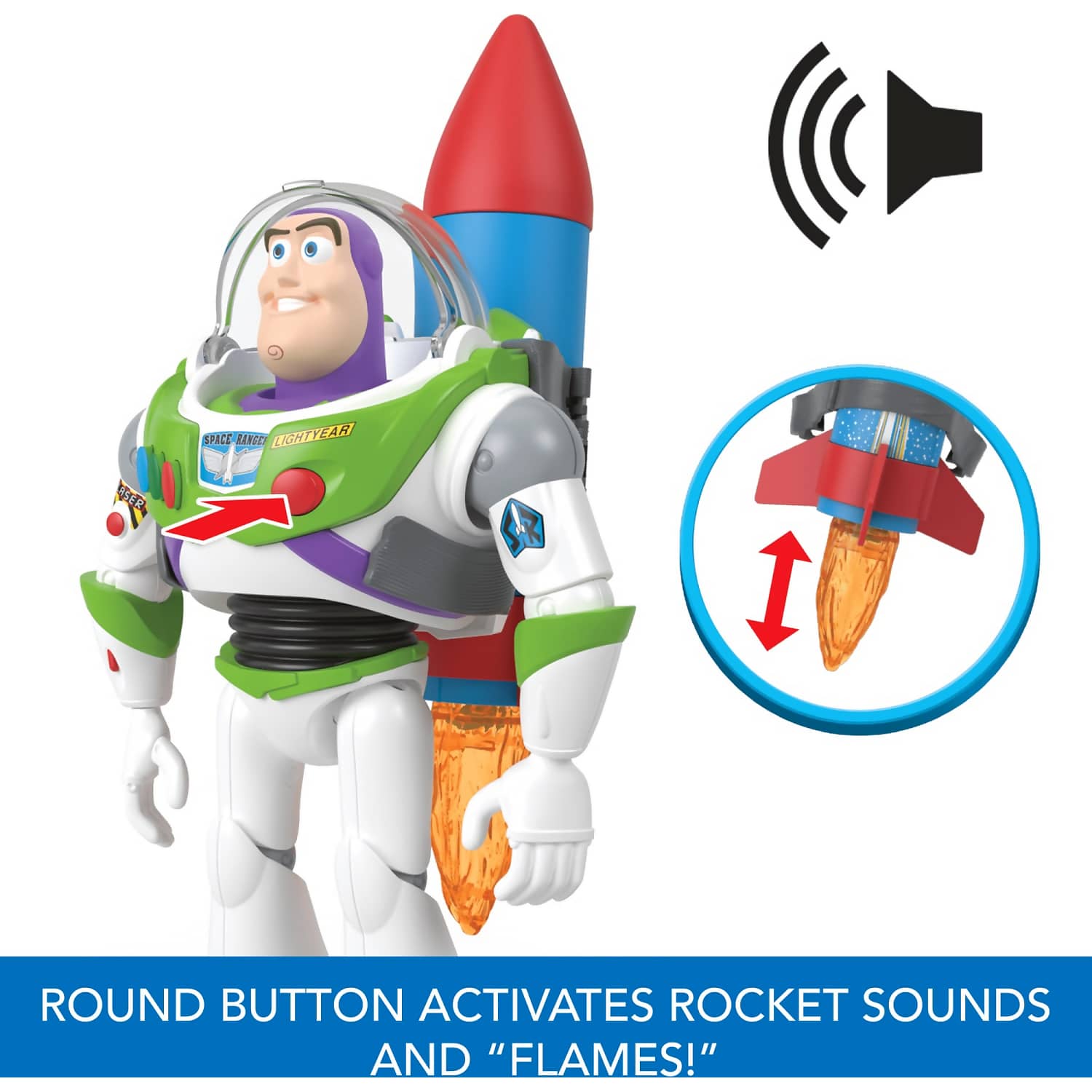- Push the button on the figure's chest to hear the movie phrases and rocket sounds. The deployable 'flames' from the bottom of the rocket propel creative storytelling and have a manual reset.