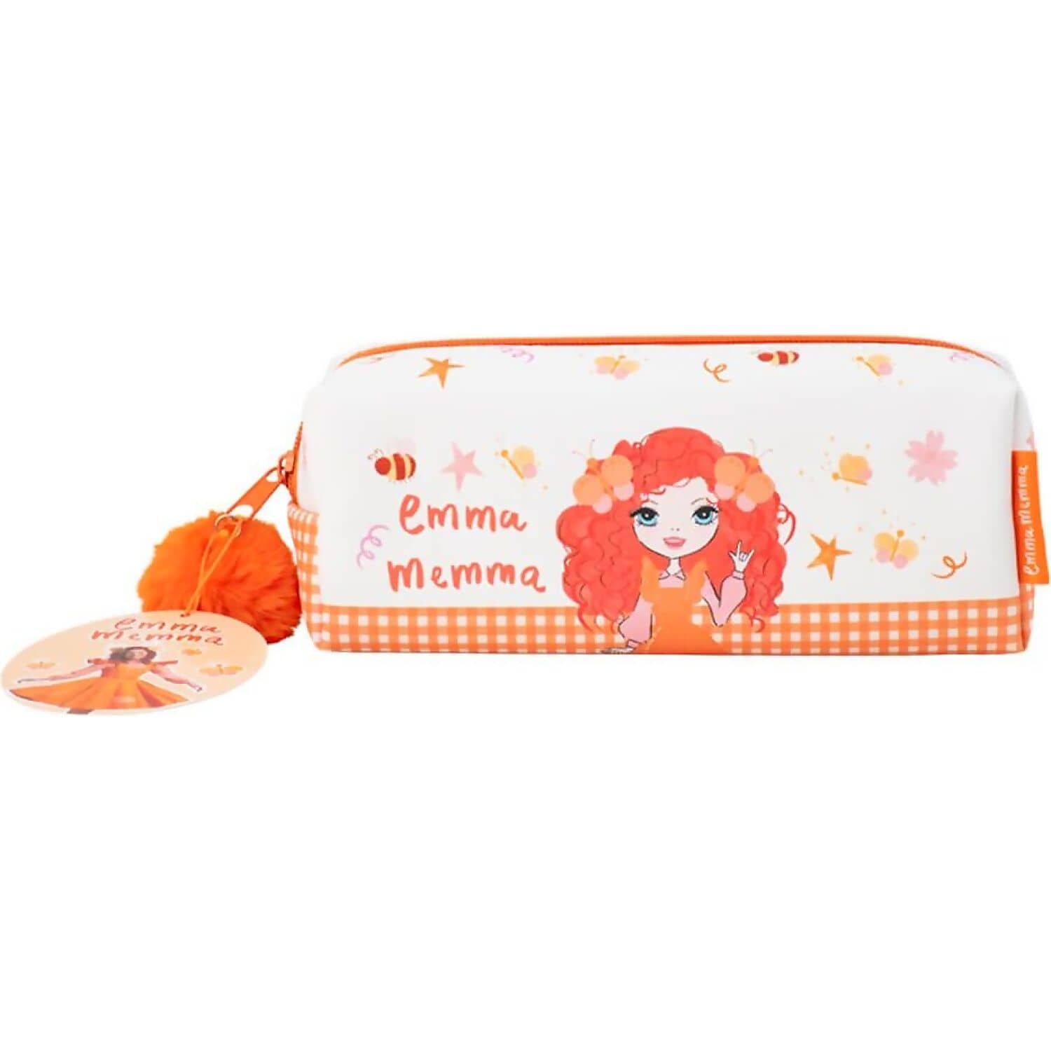A fun and practical gift for an Emma Memma fan, this vibrant transparent pencil case features an orange pom pom zipper pull for added flair. The pencil case showcases a double-sided design with Emma Memma on the front and BB Butterfly and a rainbow on the reverse side.