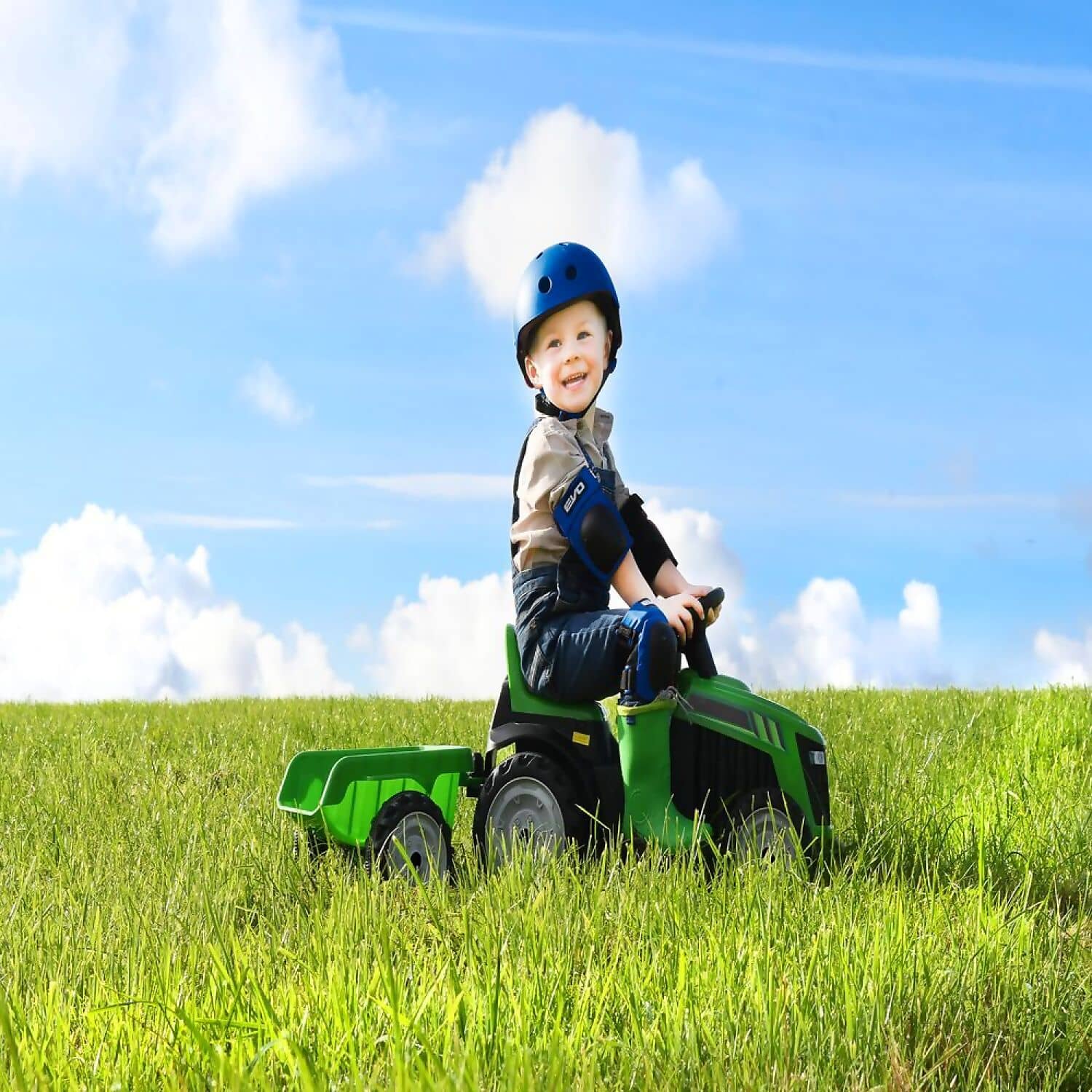 Transform any garden into a mini farm with this electronic green tractor ride on with trailer. Perfect for imaginative role-play fun, featuring chunky wheels designed to go over rough terrain.