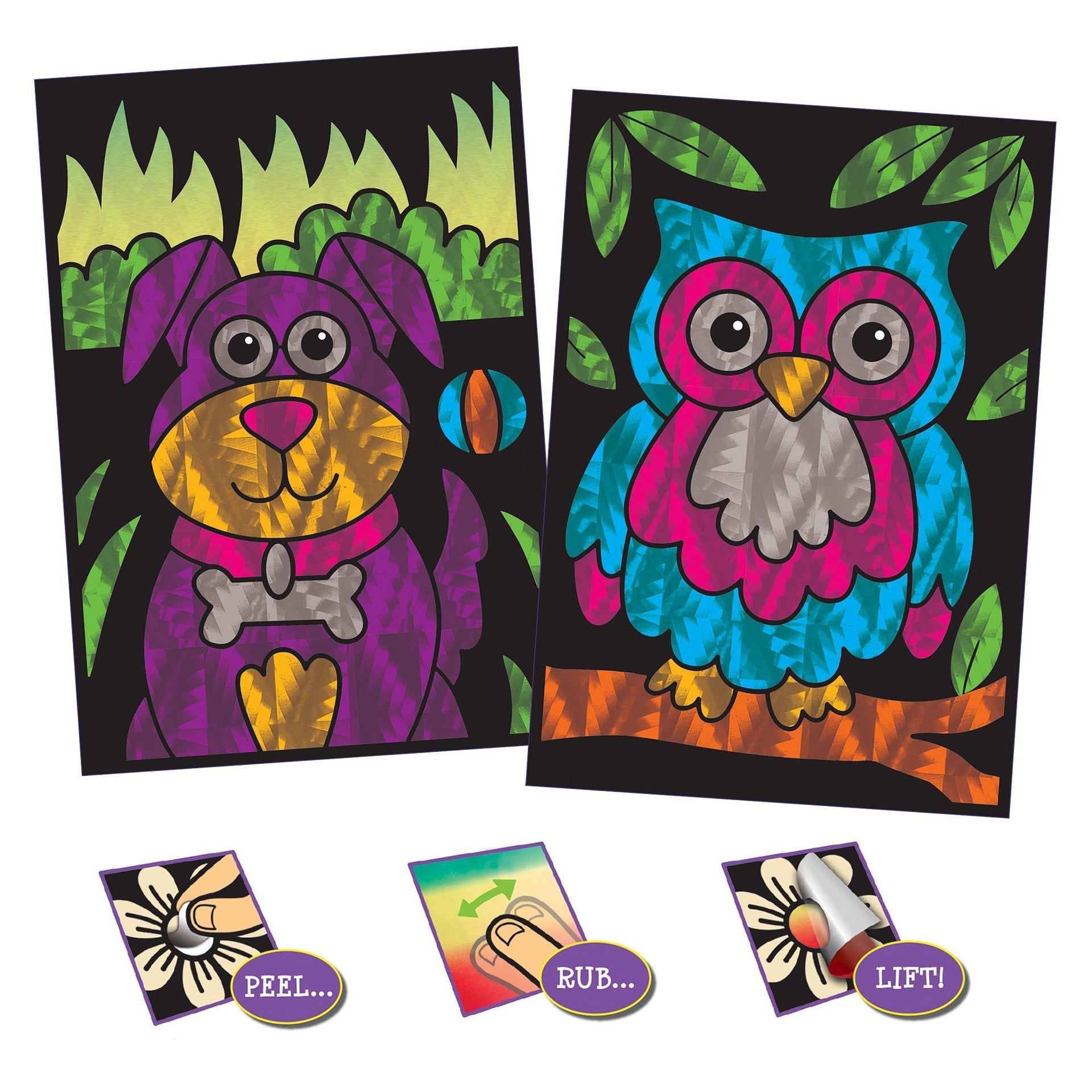 Simply peel off a section from the picture, place the foil over the sticky area and rub with your finger.