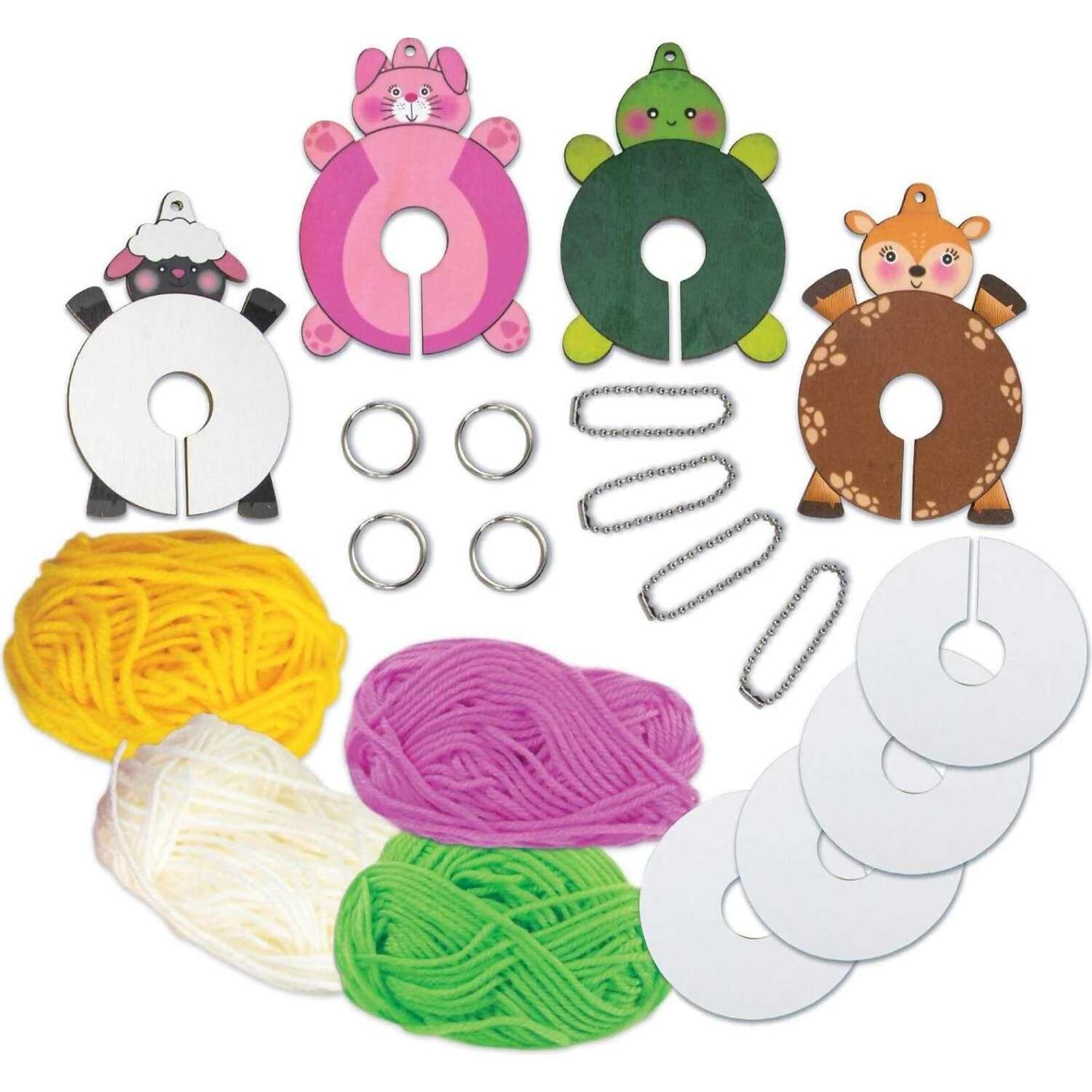 - Includes: Four wooden animal templates, 4 balls of wool, 4 card circle guides, 4 keyring loops, Four keyring chains, Guide