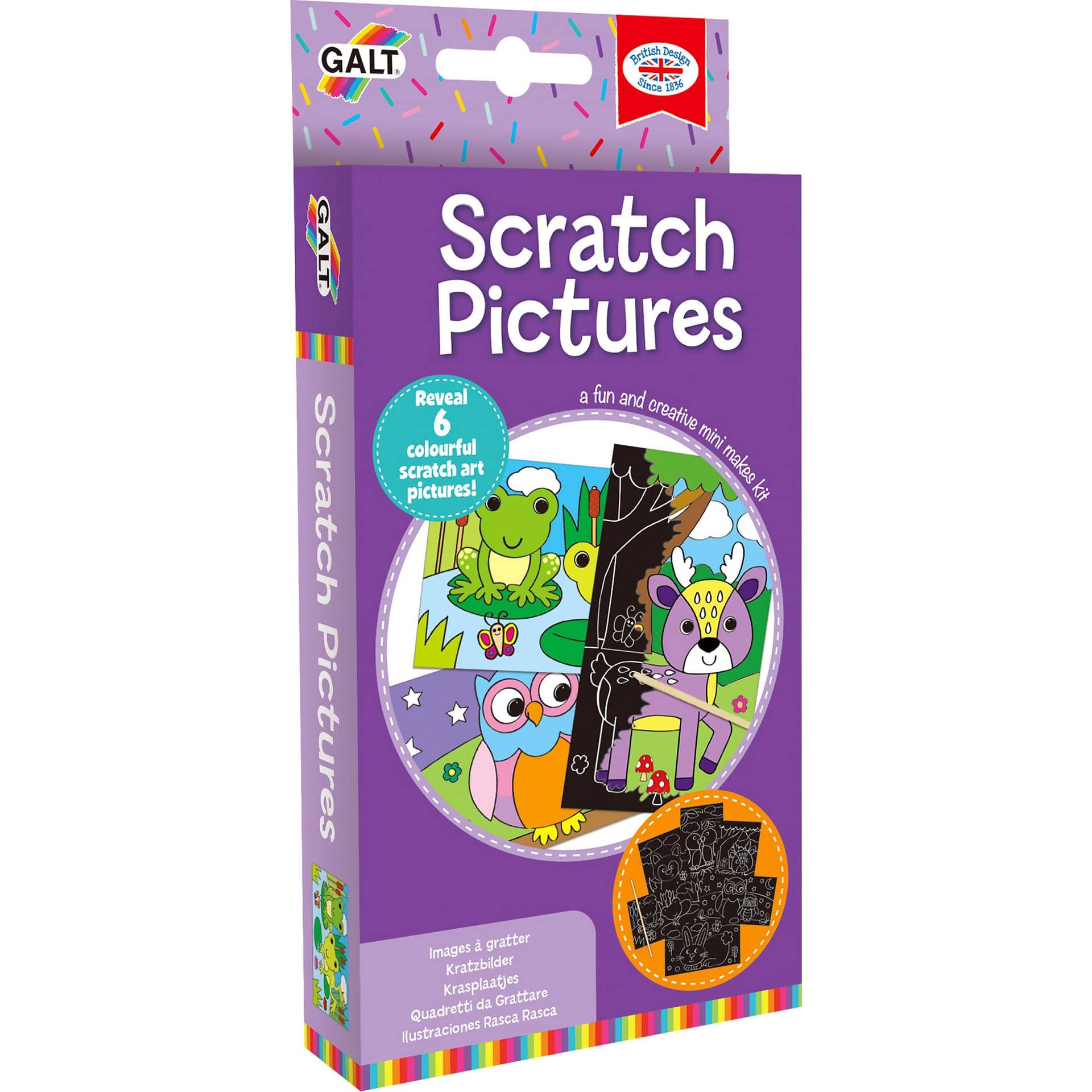 The Galt Mini Makes Scratch Picture is a fun and creative art activity that allows children to discover 6 colourful images by scratching. The set includes colourful images that are revealed by scratching with a wooden stick.