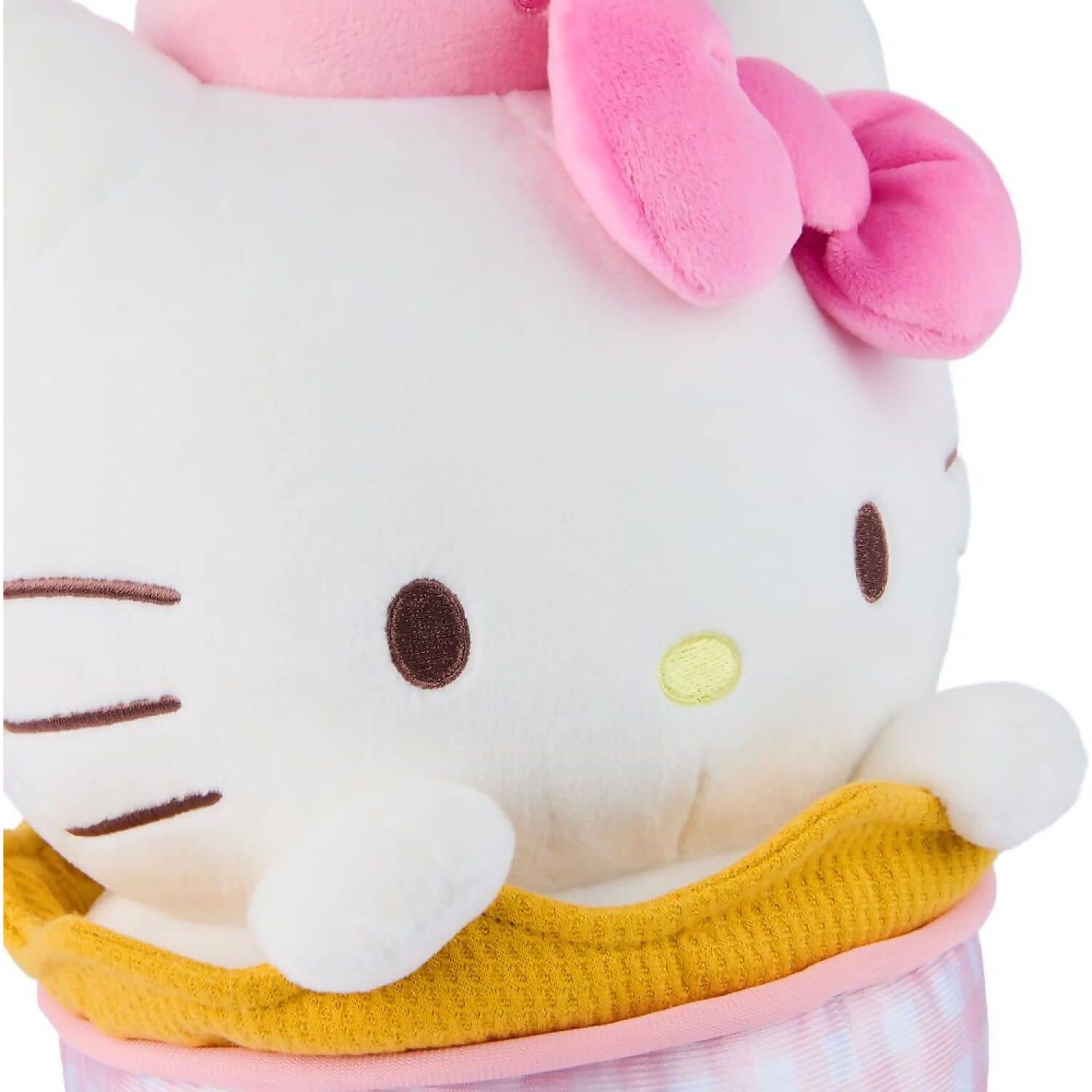 Hello Kitty is extra sweet and dressed up as a tasty ice cream sundae! This large, huggable 10-inch plush features the kawaii little girl from the world of Sanrio comfortably nestled in a satiny pink plaid gingham-pattern waffle cup, with her paws resting on the edge.