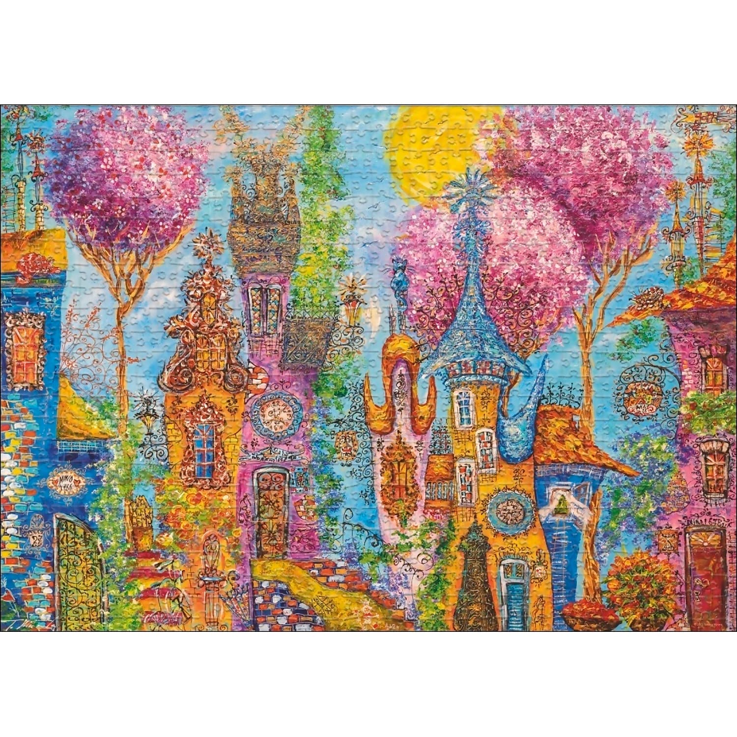 This particular puzzle showcases the work of Tatyana Murova, an artist known for her expressive colour combinations, mixing fantasy with reality. The ‘Charming Village Pink Trees’ puzzle features a vibrant village scene adorned with beautiful pink trees, reflecting Murova’s unique style and Eastern-European ambiance in her work.
