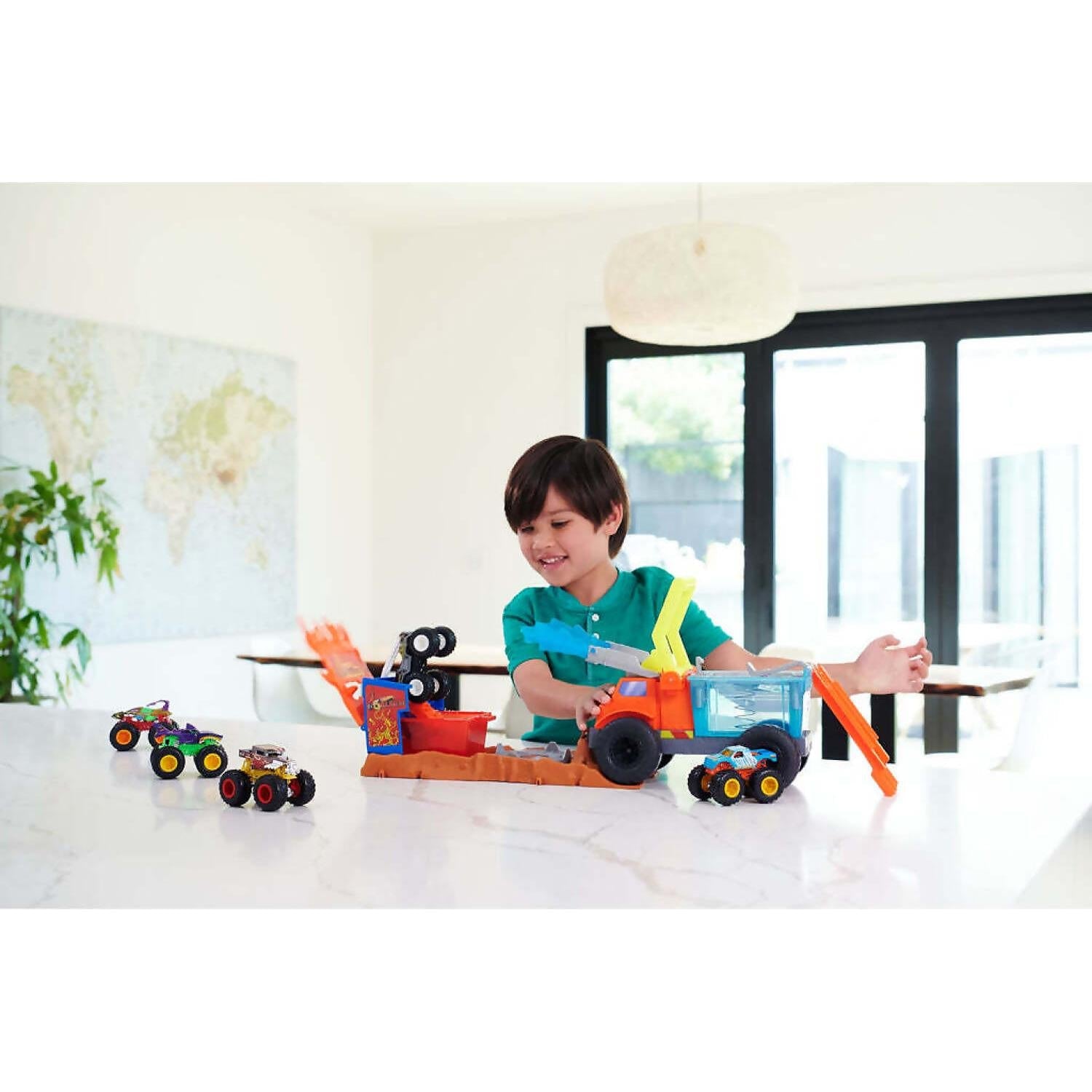 - The Hot Wheels Monster Trucks Arena Smashers Colour Shifters 5-Alarm Rescue playset packs cool sensory play with exciting colour-shifting features!