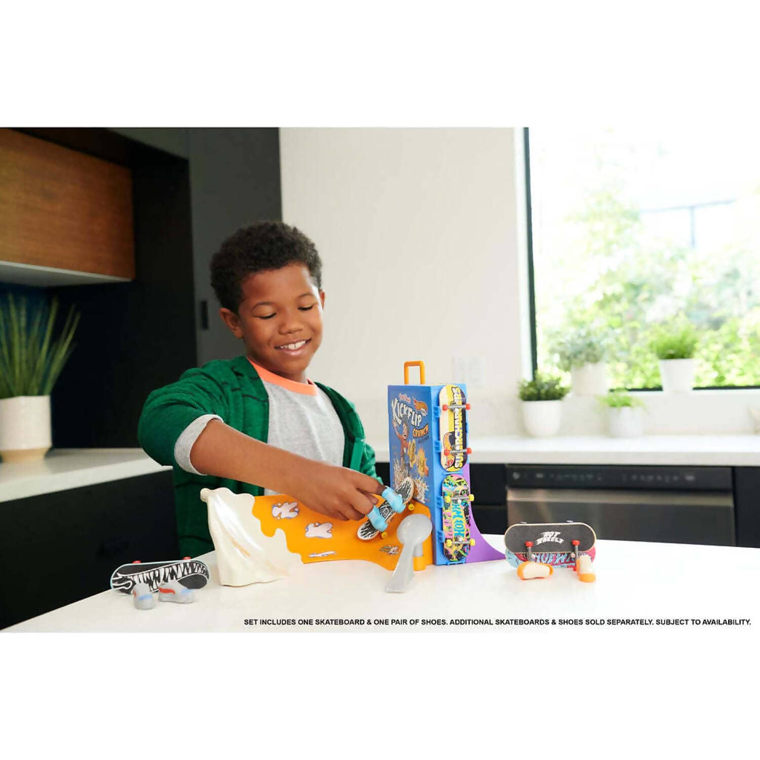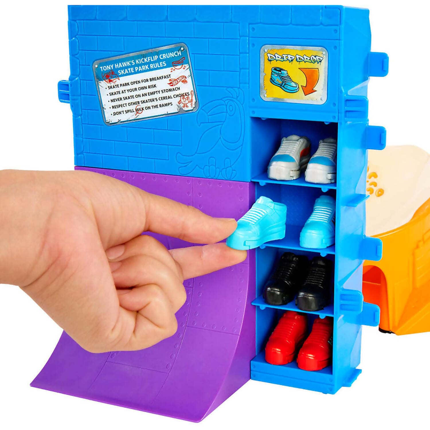Shred through an epic bowl of cereal with the Hot Wheels Skate™ Tony Hawk Cereal Skate Bowl. Created in collaboration with skateboarding legend Tony Hawk, this cereal-themed skate set invites fingerboarders to skate through a cereal bowl, perform vert tricks on the cereal box before grinding the rail at the top for a surprise trophy reveal.