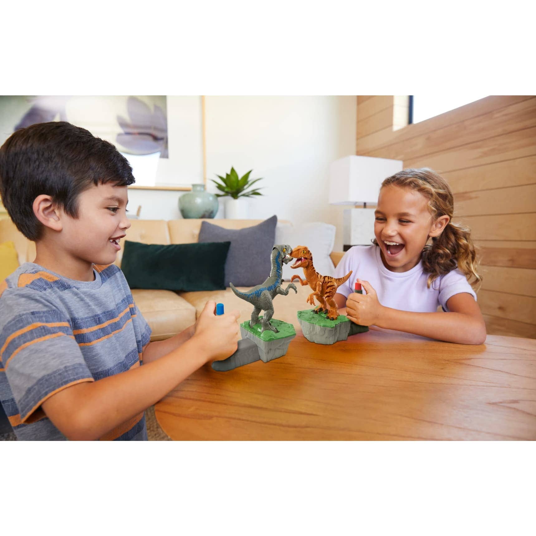 Unlike the classic Rock 'Em Sock 'Em Robots game, each raptor is attached to a base so it is not confined to a ring but can roam wild, like they do in Jurassic World Dominion, as they fight for dominance.