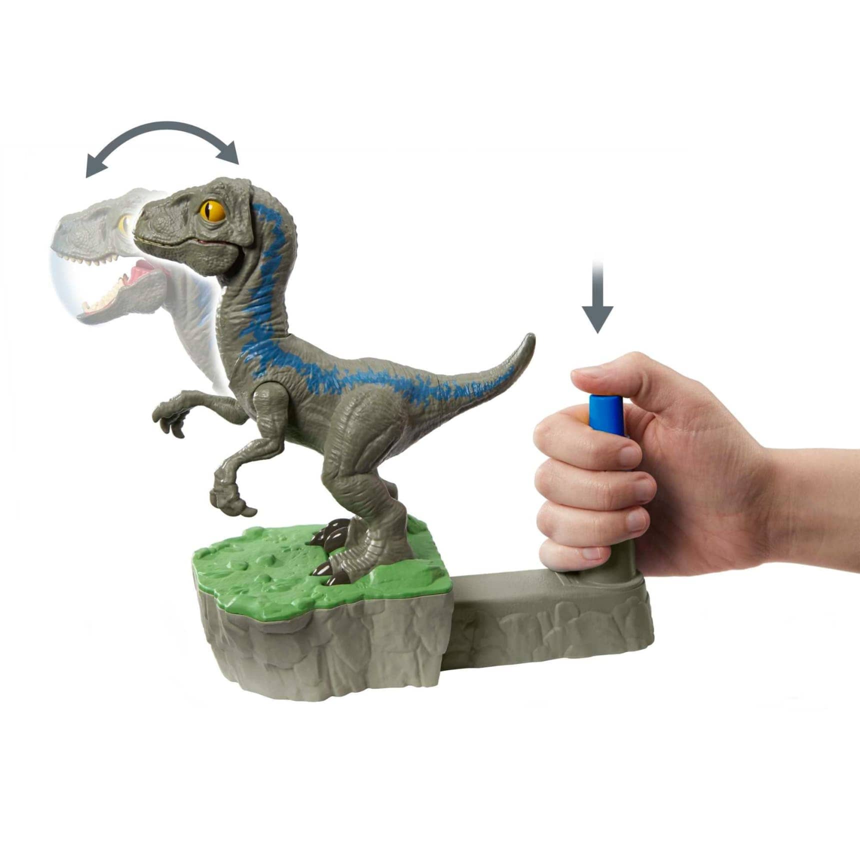 Kids control the raptor's mouth by pressing the button on the base as they try to clamp down on the other raptor's head and pull it off its base. Bite 'em off their block!
