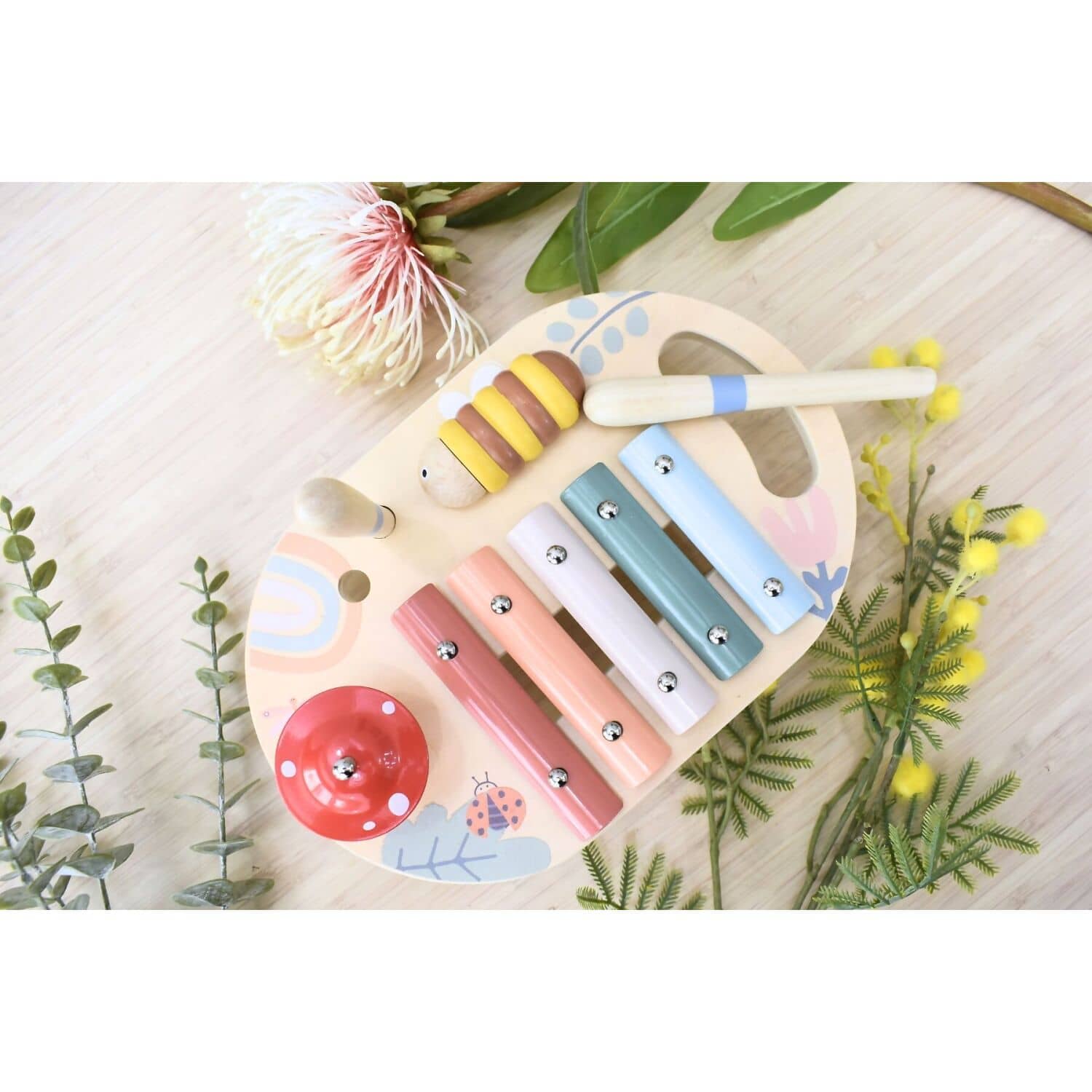 The Wooden Spring Insect Music Table features a xylophone, mushroom cymbal, and caterpillar tone block in pastel colours, perfect for developing rhythm, coordination, and motor skills in children aged 18 months and up.