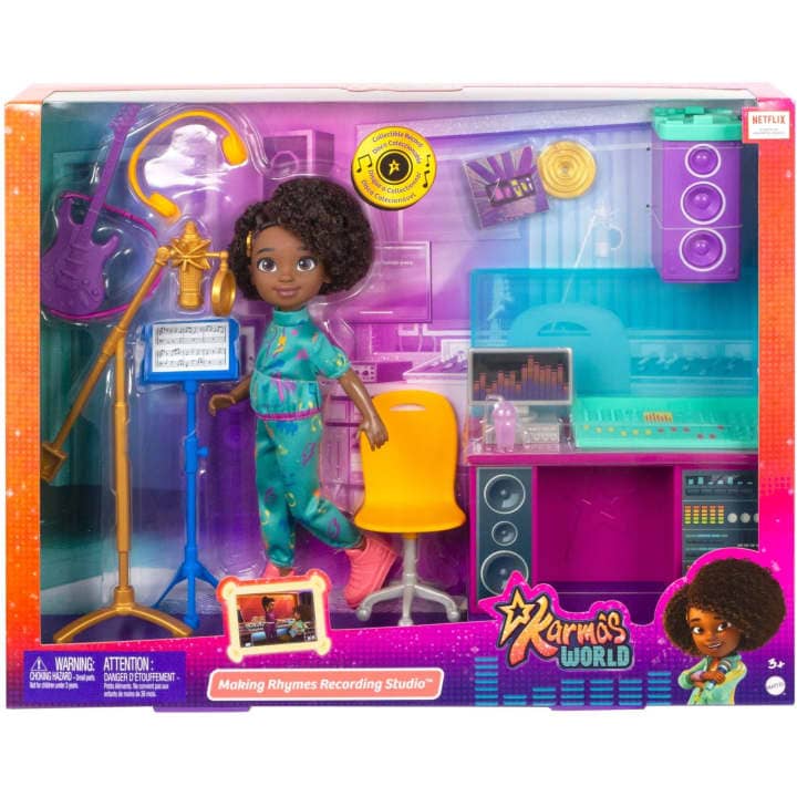 Make magic with Karma doll at this Making Rhymes Recording Studio playset! This 13-piece set is filled with good times, just like Lady K's studio in Netflix's Karma's World™. Karma doll is dressed in her fresh tracksuit and ready to rhyme.