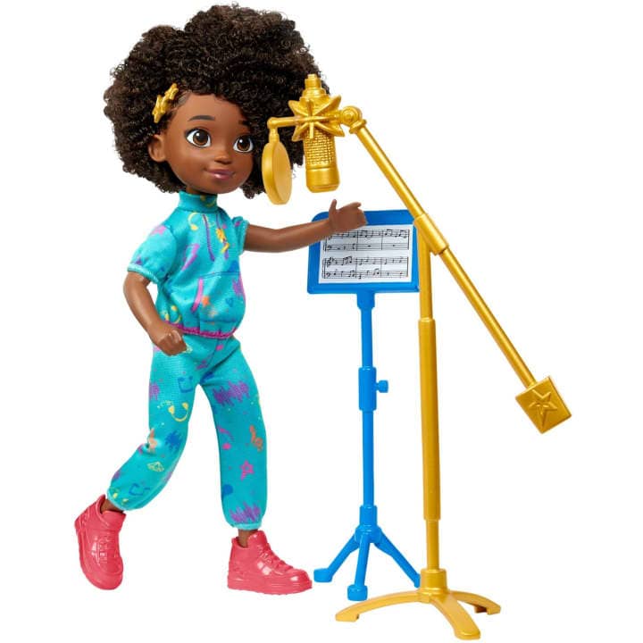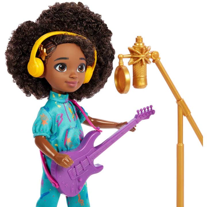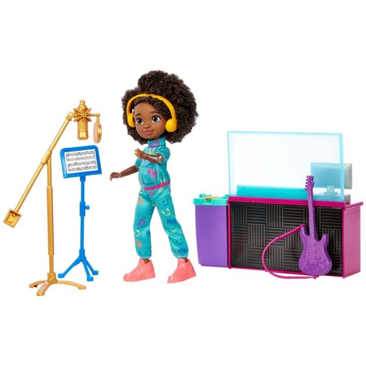 She can be both the performer and producer with this 2-sided playset that has a recording booth side and mixing side. With accessories like a guitar, microphone, headphones, and more -- Karma doll has everything she needs to make her next hit song.