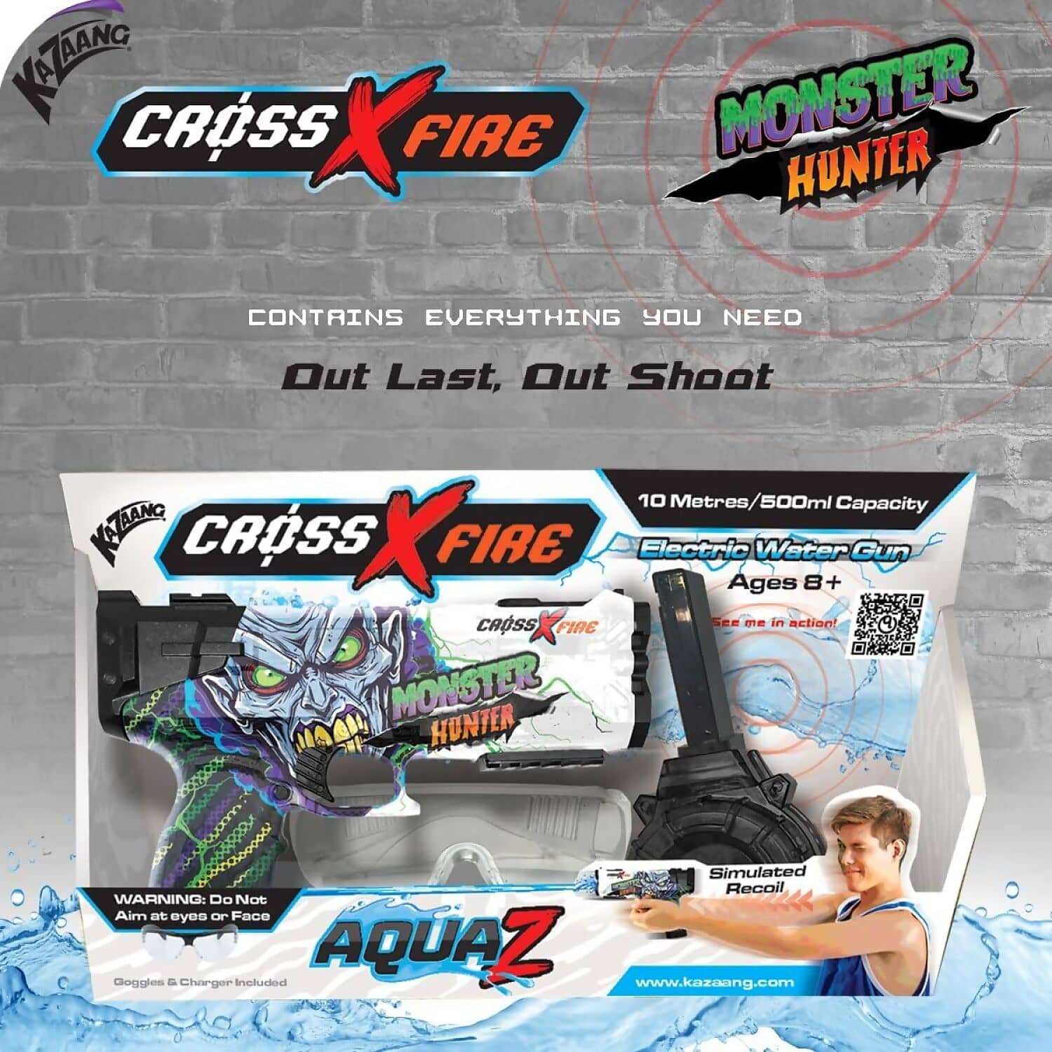 - Unleash Monstrous Shooting Power - The AquaZ CrossXFire electric water gun boasts a colossal water output, thanks to its upgraded built-in motor that delivers sheer power with every blast. The Monster Hunter-inspired design features bold animated graphics and powerful technology.