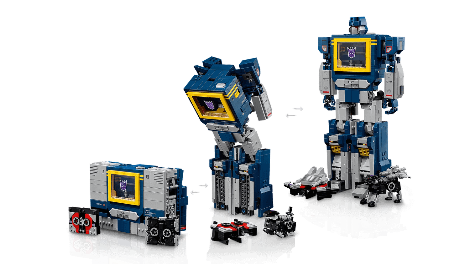 - What’s in the box? – Everything you need to craft a detailed LEGO® Icons Transformers: Soundwave figure with rocket pod, laser blaster and dart accessories, plus Ravage and Laserbeak figures