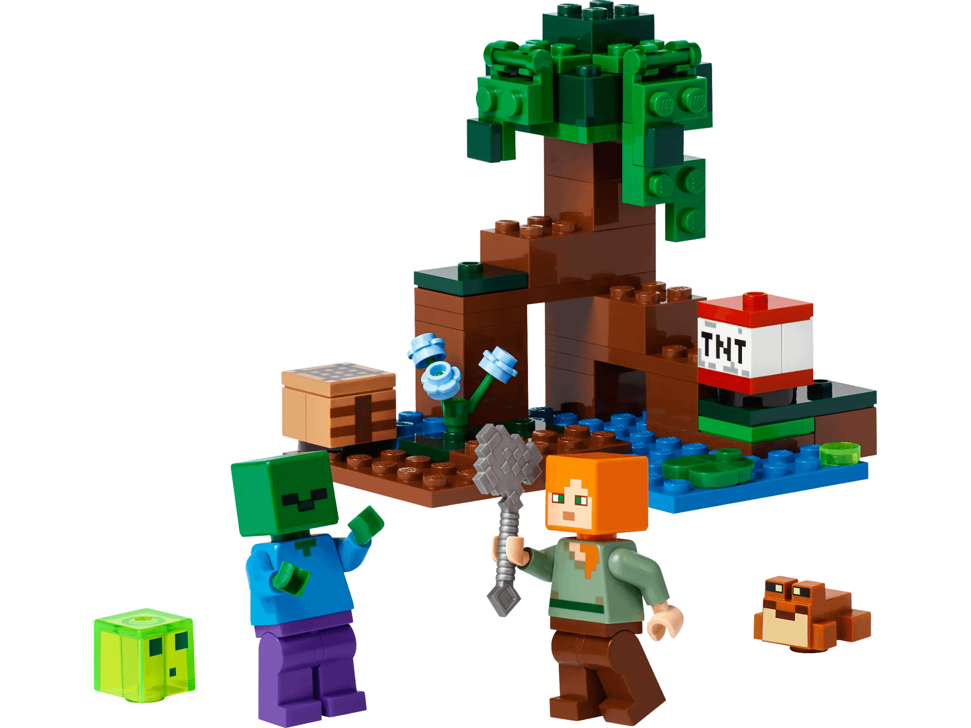 - Iconic characters – Includes familiar Minecraft® favorites Alex, a zombie, a slime block and a frog in a swamp biome complete with a mangrove tree, crafting table, axe and exploding TNT function
