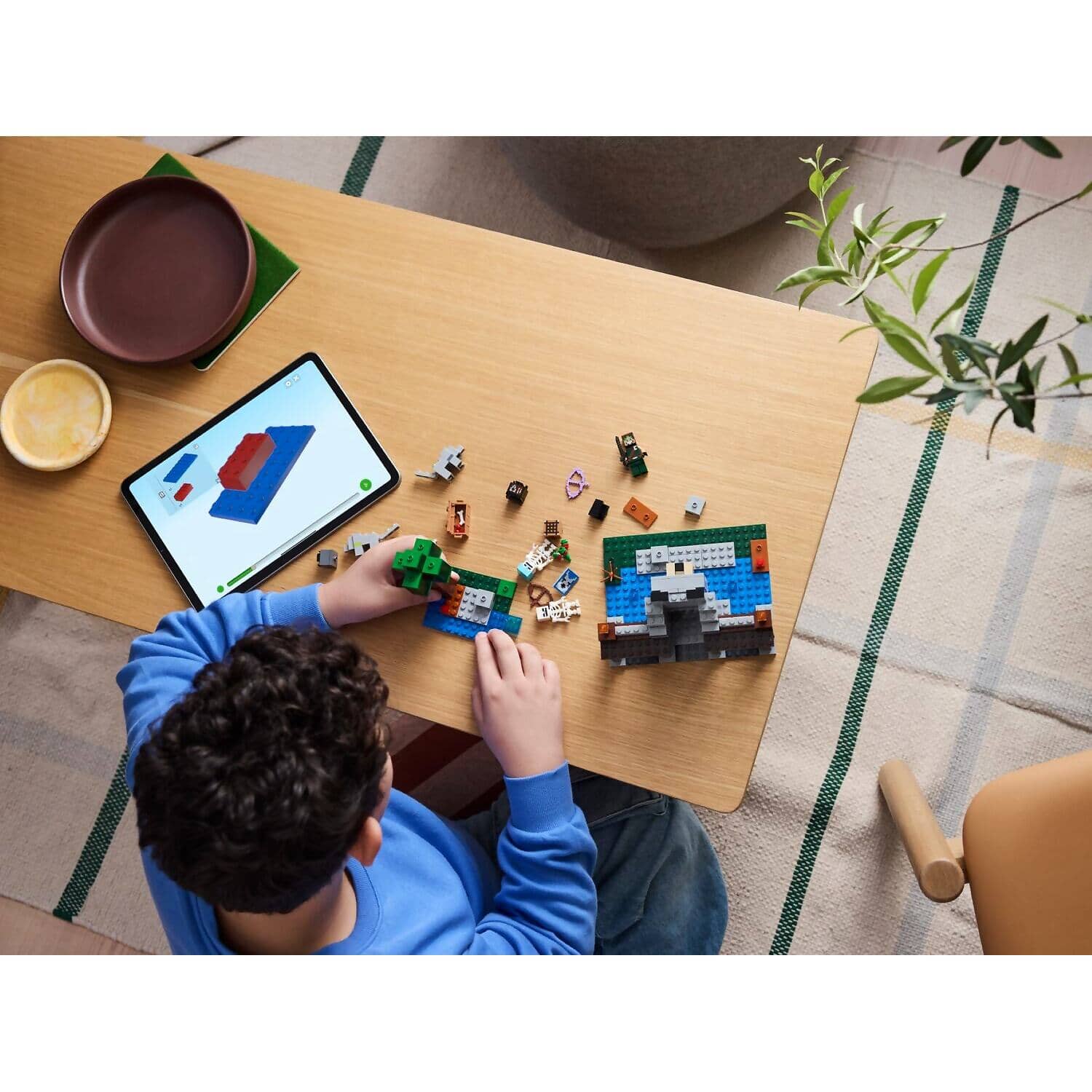 Kids build the Wolf Tamer a base featuring a big wolf’s head above the entrance, then have fun switching the wolf’s face from friendly to angry. Inside is a crafting table, blast furnace , anvil and, for the first time in a LEGO Minecraft set, a smithing table. A chest of supplies contains a Netherite ingot, which kids can craft into a sword, sweet berries, and bones that are used to tame the wild wolf. Outside is a forest section with a tree, boulder, mushroom and sweet berry bush. 2 Minecraft skeleton toys wander the forest: one has an enchanted bow, the other has a bow and arrow and diamond helmet. For added digital fun, builders can use the intuitive LEGO Builder app.