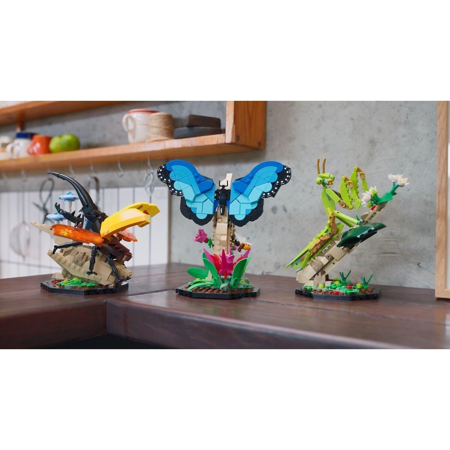 The blue morpho butterfly has adjustable wings featuring LEGO elements in different shades of blue and is displayed with a buildable flower and a honeybee. The Hercules beetle has attachable wings and the characteristic horns of the male of the species, while the fully posable female Chinese mantis (a species of praying mantis) comes with a 7-spot ladybird. Separate building instructions are included for each model, so you can build solo or with others.
