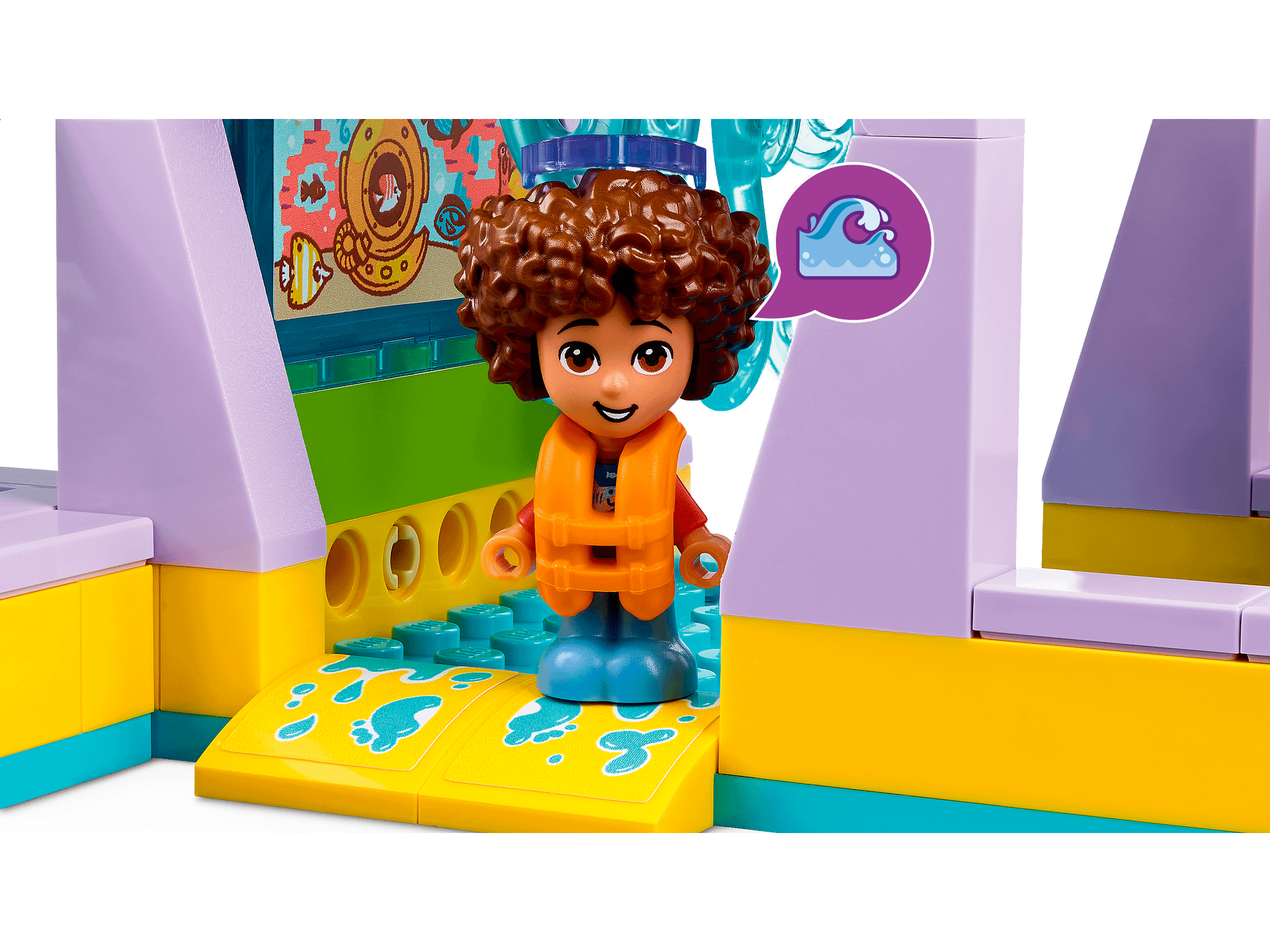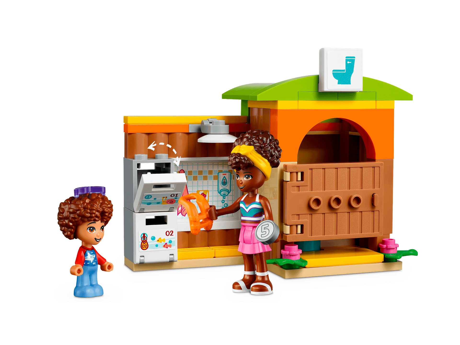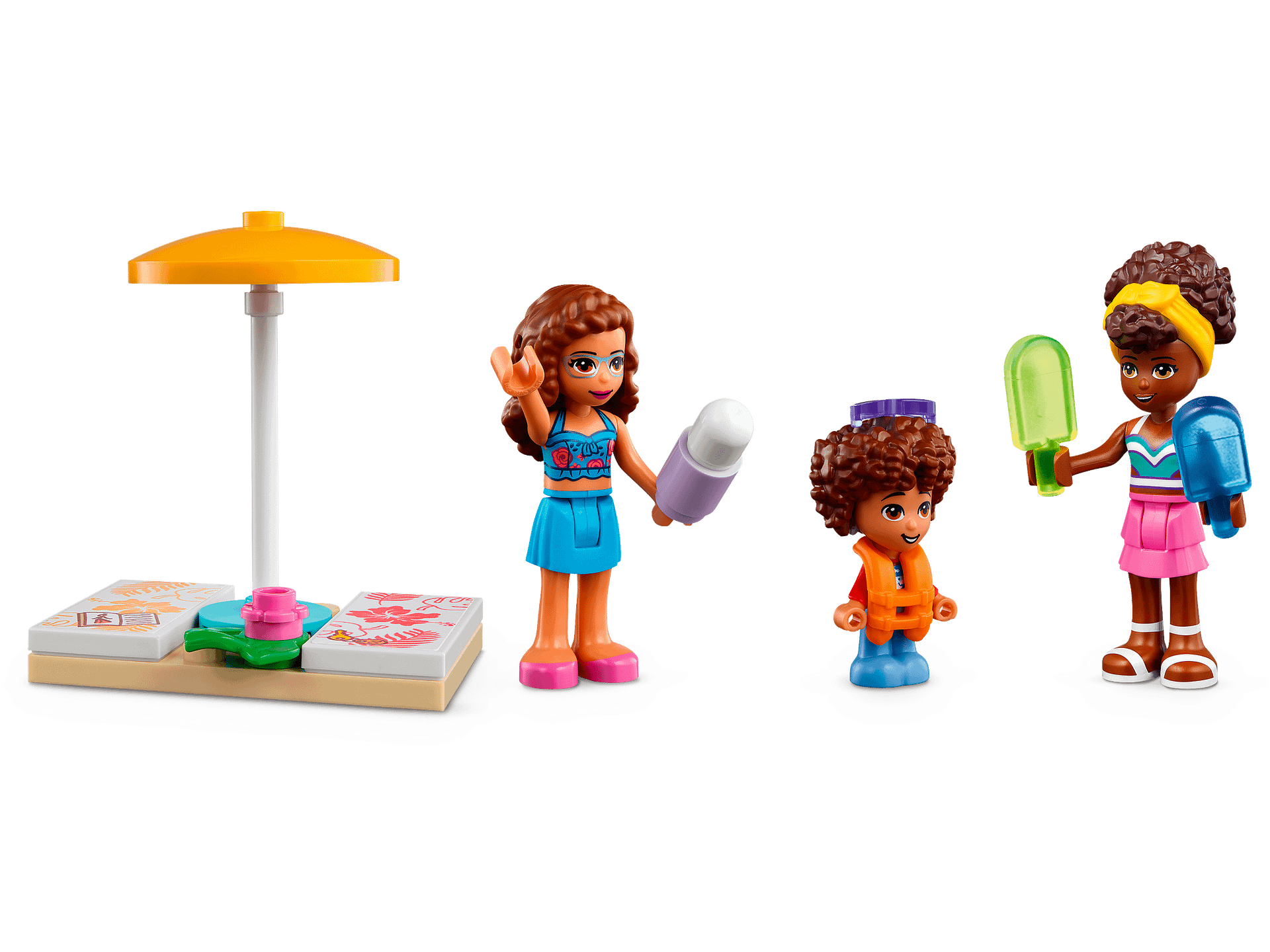 There are lots of realistic features to explore, including 2 slides, a spraying octopus, waterfall shower and a grotto with an aquarium. Away from the splash action is a cute changing area complete with a shower and restroom. LEGO Friends Olivia, Santiago and Nandi can cool down with a treat from the popsicle stand and relax under the sunshades.