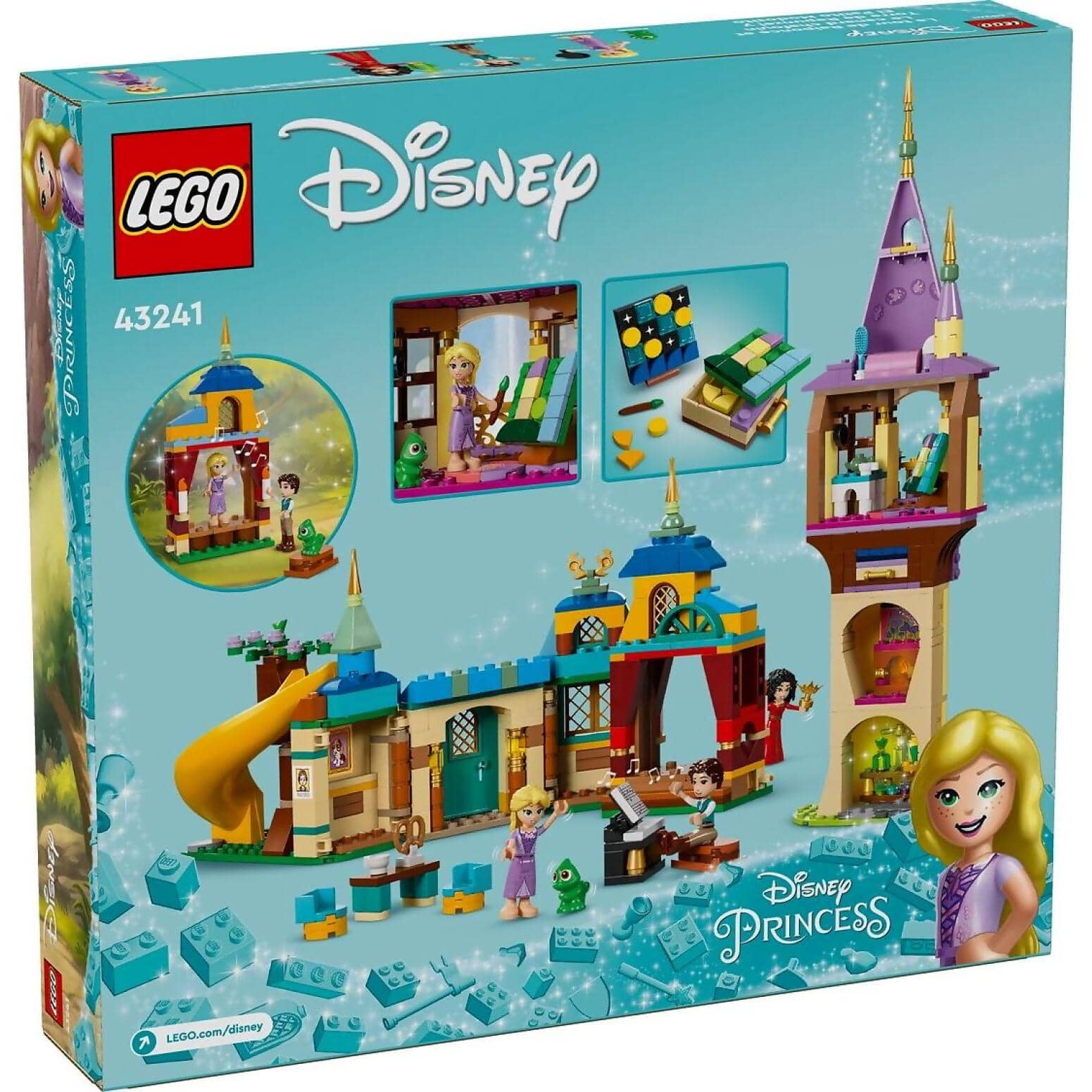 New adventures await Disney Tangled fans and kids aged 6+ with this LEGO® ǀ Disney Princess Rapunzel’s Tower & The Snuggly Duckling (43241) construction toy set. Inside the box is a 4-level tower with a secret lab, kitchen/art room, bedroom, a zip line to the inn and a drawer with an extra painting and elements.