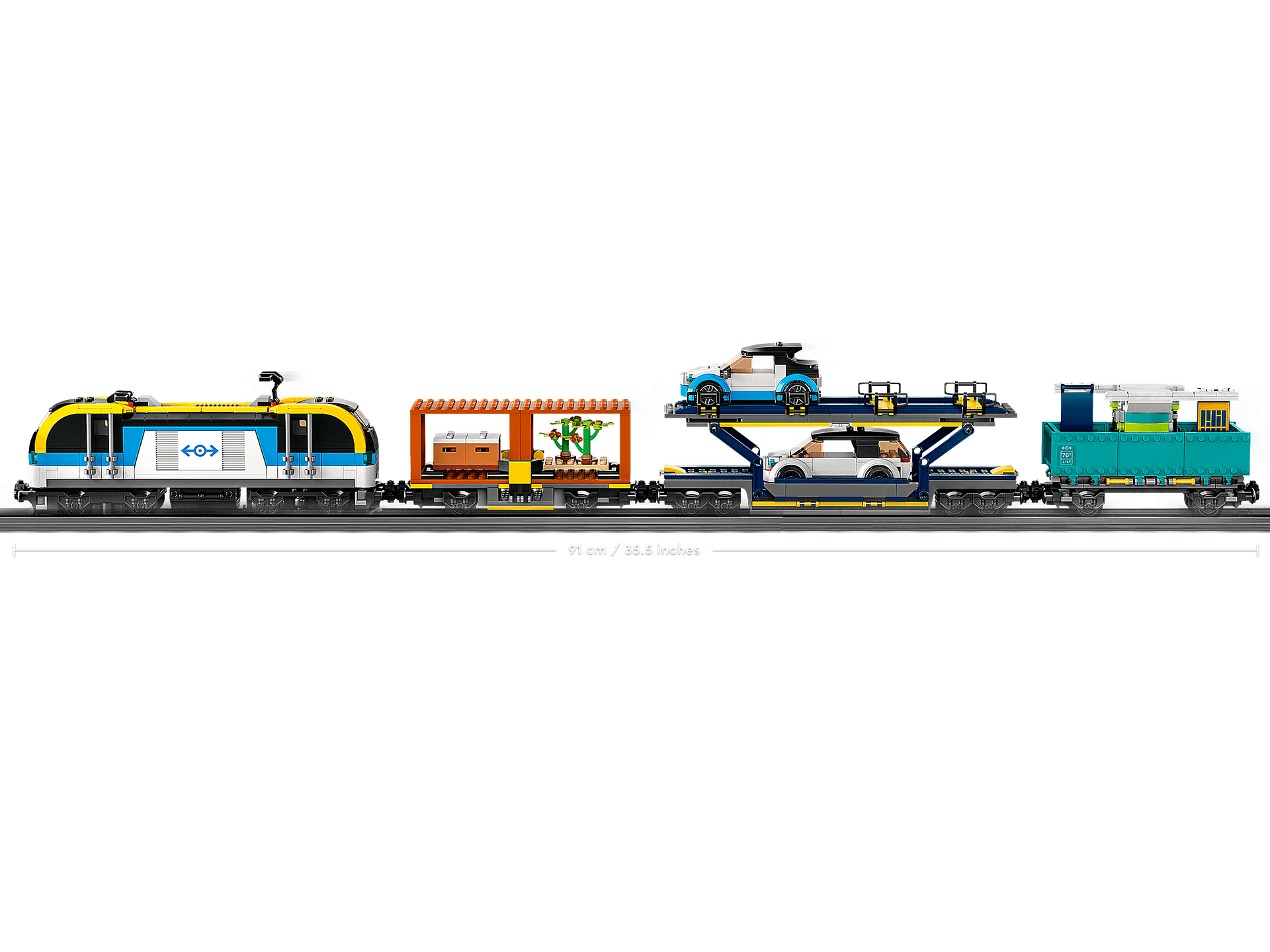 - Dimensions – When built, the LEGO® City Freight Train measures over 3.5 in. (9 cm) high, 35.5 in. (90 cm) long and 2.5 in. (6 cm) wide