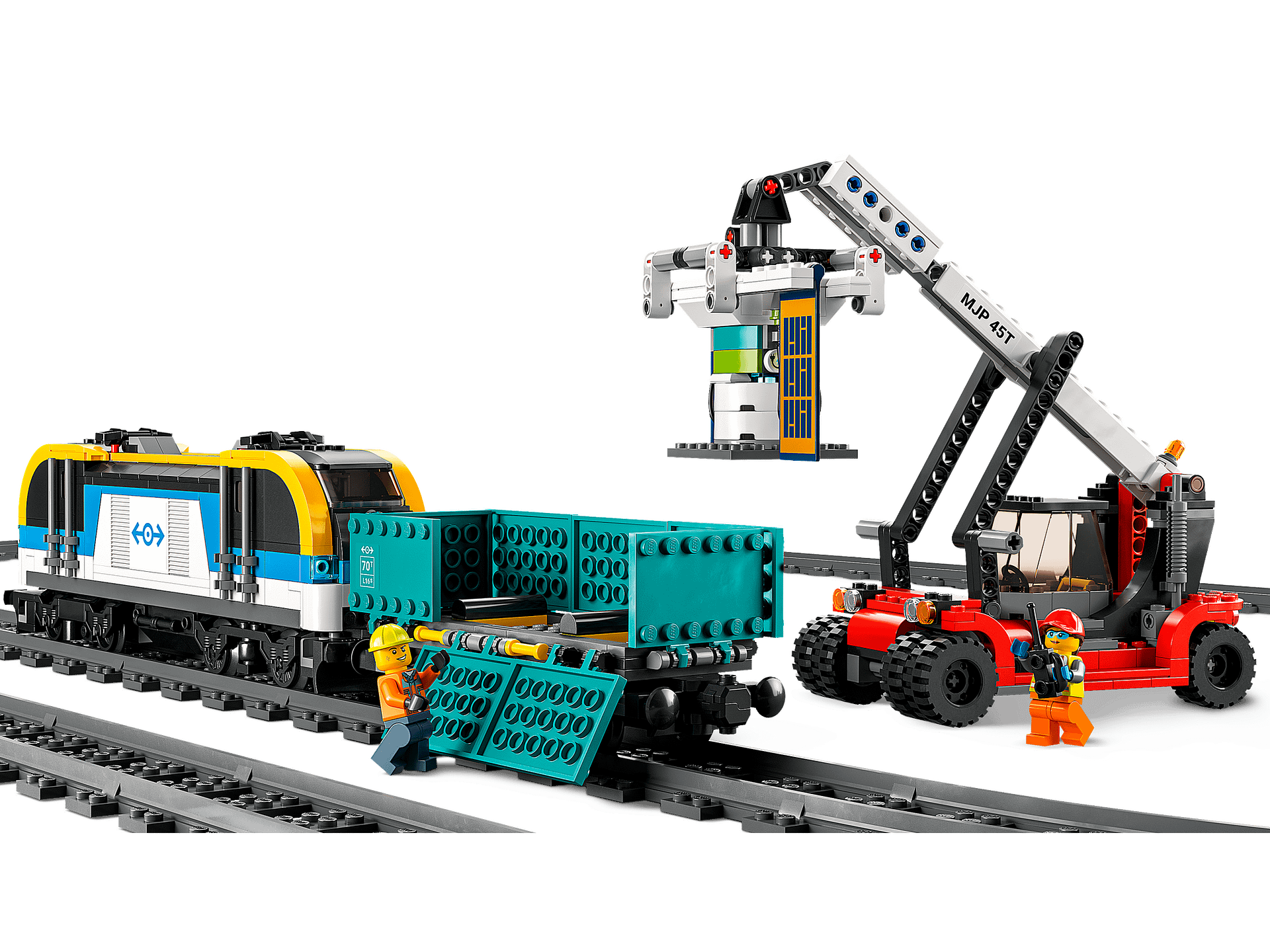 - What’s in the box? – Includes a locomotive, flatcar, open wagon, auto carrier, 2 EVs, toy charging station, 2 cargo containers, reach stacker, 33 track pieces and 6 minifigures