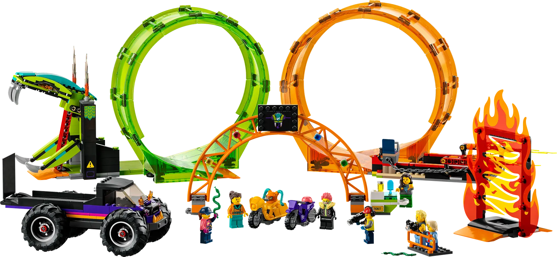 This LEGO® City Double Loop Stunt Arena (60339) playset is packed with features and comes with 2 flywheel-powered stunt bikes and a monster truck with a ramp for performing real stunts. Arena props include a toy wall of flames, snapping snake loop and a loop of fire, plus lots of cool accessories.